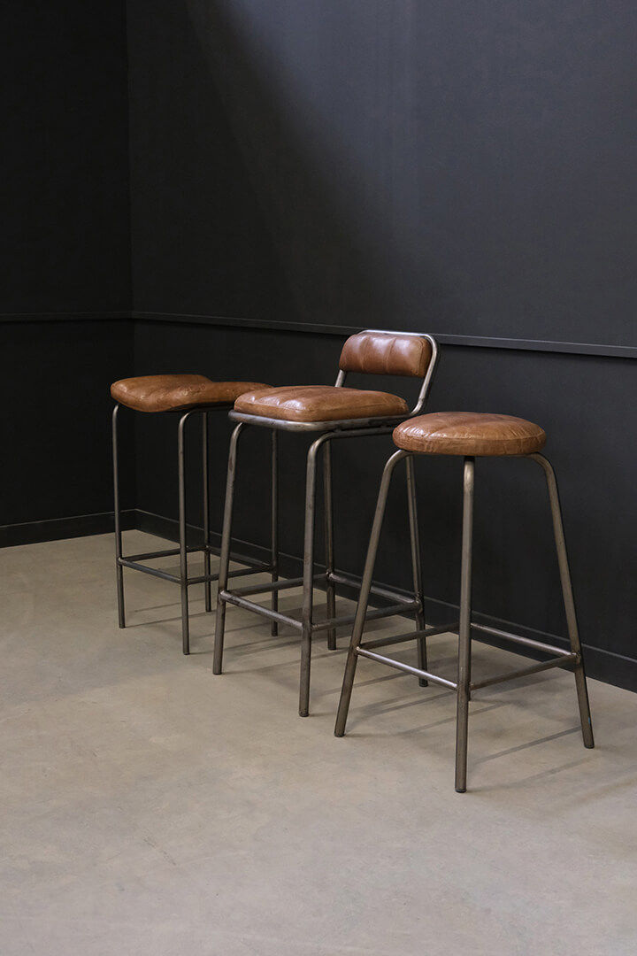Barstol fremstillet i kraftig lakeret jern med et rundt polstret lædersæde. Denne barstol er robust og let at flytte rundt på. Den vil ikke bare se fremragende ud på restauranten eller i caféen, men også i den stue eller i dit køkken derhjemme. Det polstrede lædersæde giver en behagelig siddeoplevelse. Sædehynden er 36 cm. i diameter