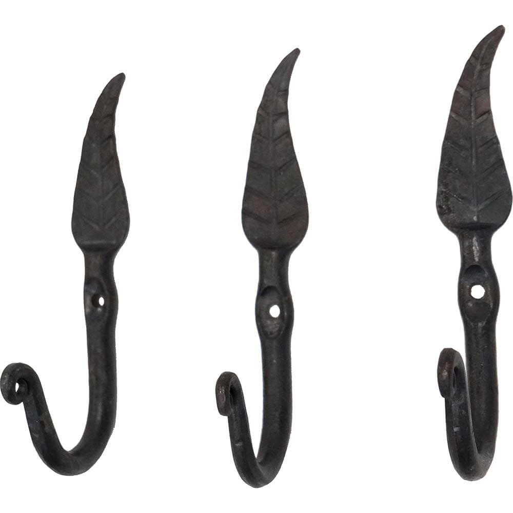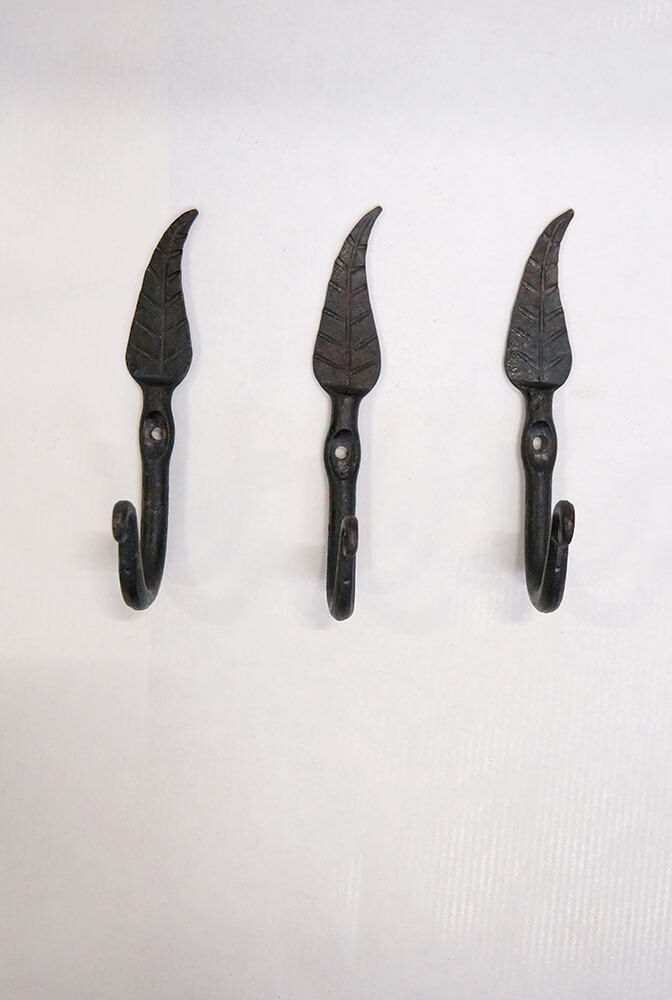 Denne jernknage har et enkelt bladmotiv som dekoration øverst, hvilket giver den et naturligt og organisk udtryk. Det fint udformede blad er detaljeret med indgraverede årer. Knagen er lavet af solidt jern med en mørk patina, der giver den et råt og rustikt look. Med sin snirklede krog nedenunder er den både dekorativ og praktisk til at hænge f.eks. jakker, nøgler eller håndklæder på. Jernknagen er perfekt til at tilføje et strejf af naturen til din entré, køkken eller badeværelse.