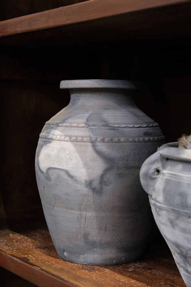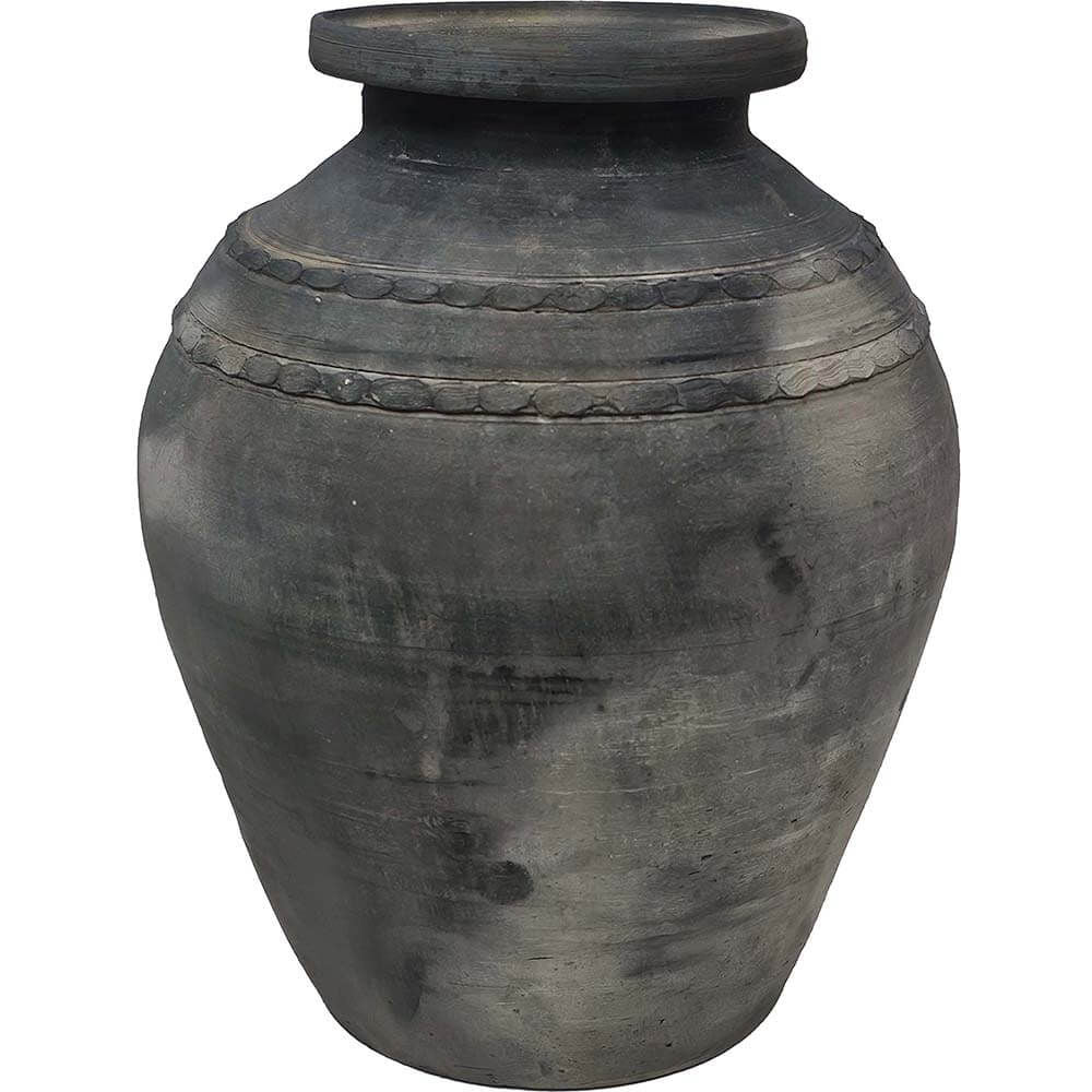 Denne lerkrukke har en klassisk form med smukke detaljerede mønstre omkring halsen, der giver den et autentisk udtryk. Den mørke patina og variationerne i overfladen giver et håndlavet udtryk. Perfekt som en statement-dekoration i et moderne eller rustikt hjem. Den kan bruges til tørrede blomster, grene eller blot som en selvstændig stemningsspreder, der bringer varme og personlighed til rummet. Bemærk venligst at krukken ikke er vandtæt