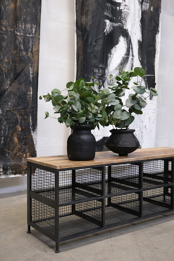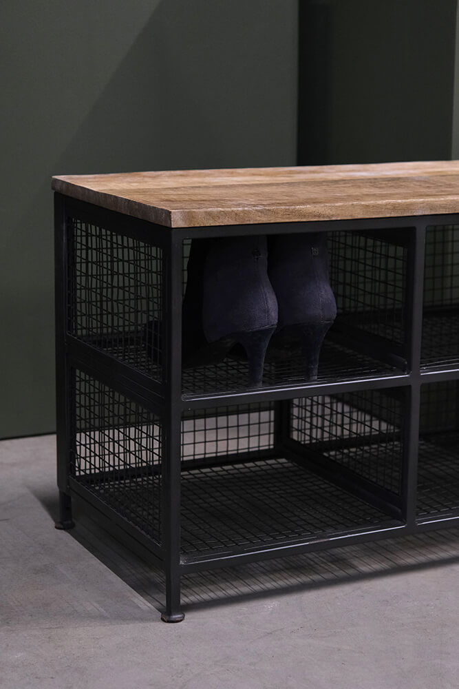 Denne skoreol er både praktisk og stilfuld med sin kombination af genbrugstræ og metal. De 8 rummelige sektioner giver masser af plads til sko, eller kasser til opbevaring af eksempelvis tørklæder, huer og handsker. Det solide genbrugstræ på toppen fungerer perfekt som en bænk, hvilket gør skoreolen ideel til entréen eller garderoben. Metallets industrielle look giver møblet en rå kant, der passer godt ind i moderne, minimalistiske eller rustikke indretninger. En funktionel løsning, der både organiserer og tilføjer karakter til dit hjem. Hvert rum måler: H:17 cm., V:18 cm., D:33 cm.