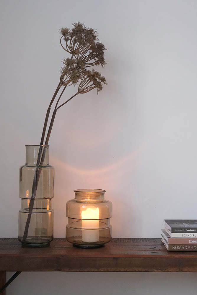 Denne stilrene smukke glasvase i røgfarve, er en skulptur i sig selv og passer perfekt ind i den moderne indretning. Vasen har en højde der gør, at den også kan bruges som gulvvase. Glasvasen kan også stilles på bordet med andre dekorative ting i forskellige størrelser, former og farver i et stilleben og dermed skabe et personligt og levende look. Vasen er lavet af 100% genbrugsglas, og der kan derfor forekomme små bobler og mindre ujævnheder i glasset.