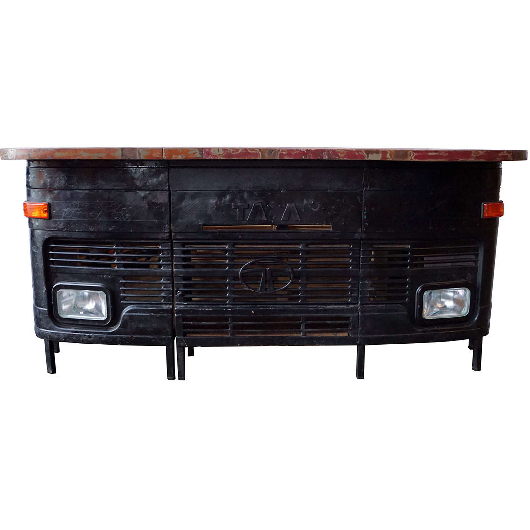 COOL bar med et maskulin udtryk - sort malet. Fremstillet af fronten fra en gammel TATA lastbil. Toplade og hylder i baren er fremstillet af genbrugstræ. En rigtig eye-catcher!