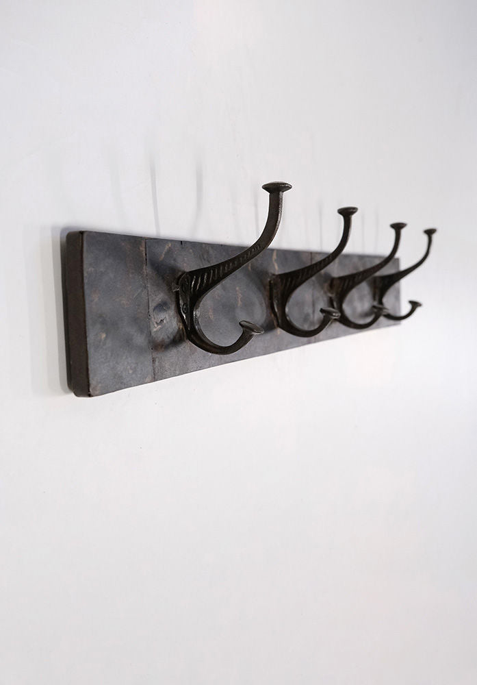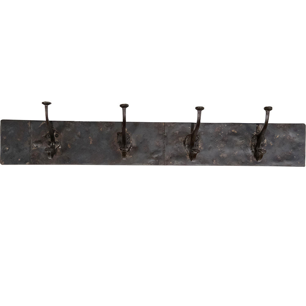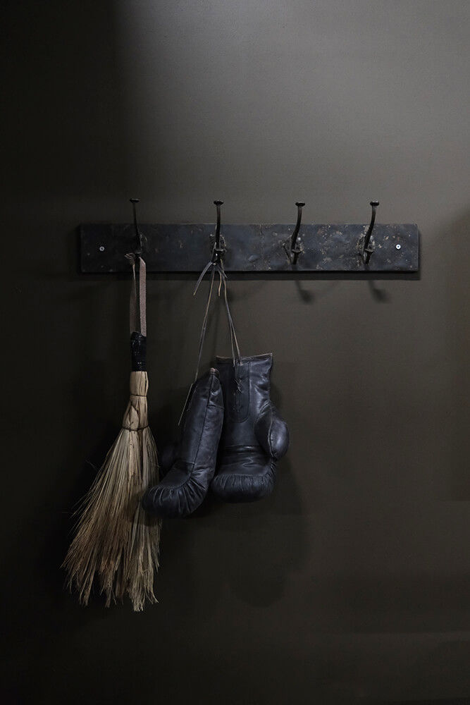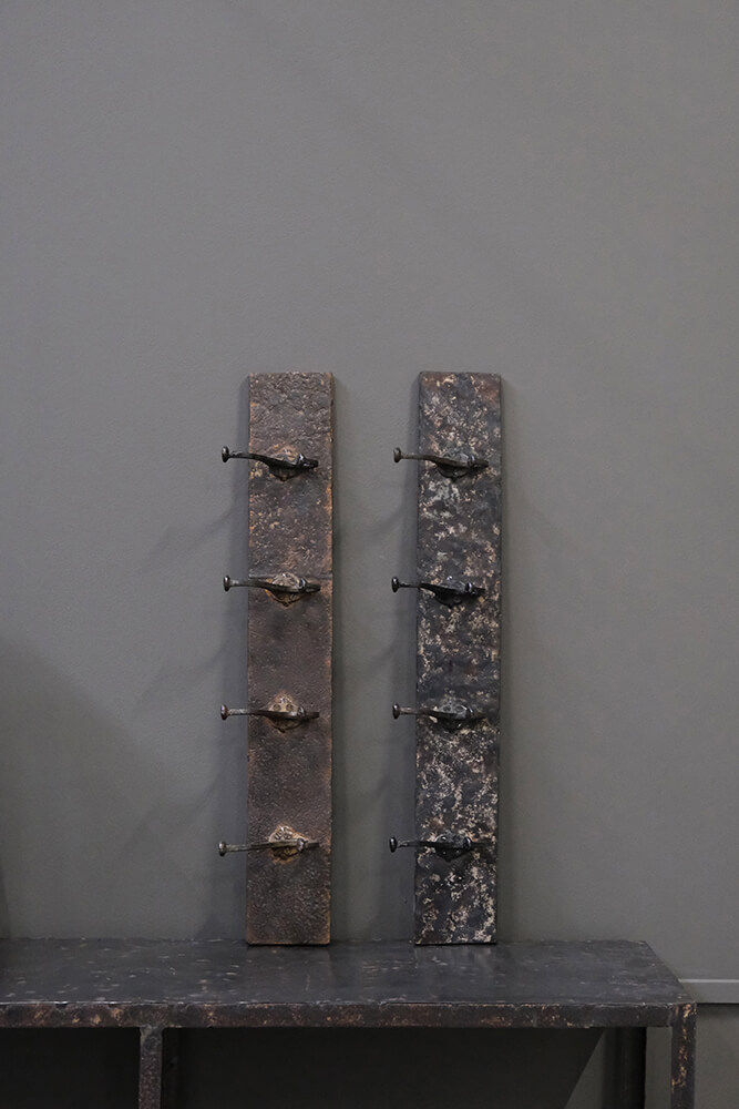 Ella knagerække med 4 knager i jern – en rå og upcycled løsning til din væg. Bagpladen på denne knagerække er skabt af genbrugte køreplader, som tidligere har tjent i Indiens industriområder. Denne karakteristiske baggrund bærer præg af sin industrielle fortid, med spor af cement og lignende materialer, der tilføjer autenticitet og historie til hvert eksemplar. Med dens fire knager giver den en praktisk mulighed for at organisering, samtidig med at den fortæller en historie. Lad Ella knagerækken være det funktionelle og maskuline indslag, der skiller sig ud i din indretning.