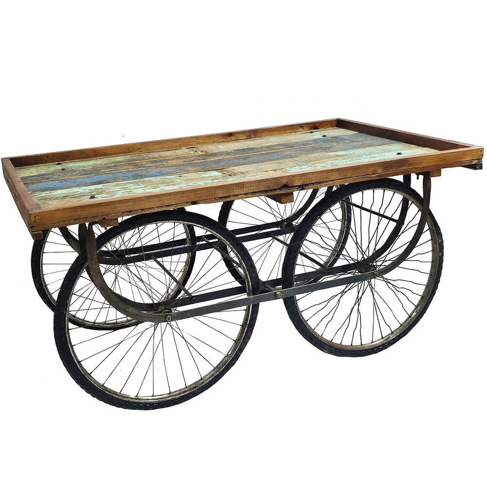 Denne flotte gamle markedsvogn emmer af historie og sjæl. Den har trillet rundt på larmende, farverige og eventyrlige indiske markeder, hvor den har fungeret som madbod, grøntsagsbod eller noget helt andet. Bordpladen i smukt, patineret træ tilføjer et råt og autentisk udtryk, mens de store jernhjul giver den et industrielt og robust look. Nu har du chancen for at give vognen et nyt liv – den er perfekt som et unikt blikfang i din butik, café eller restaurant. Brug den som et dekorativt serveringsbord, et display til varer eller som en del af en charmerende indretning med kant. Mulighederne er mange, og denne vogn er klar til at skabe nye historier!