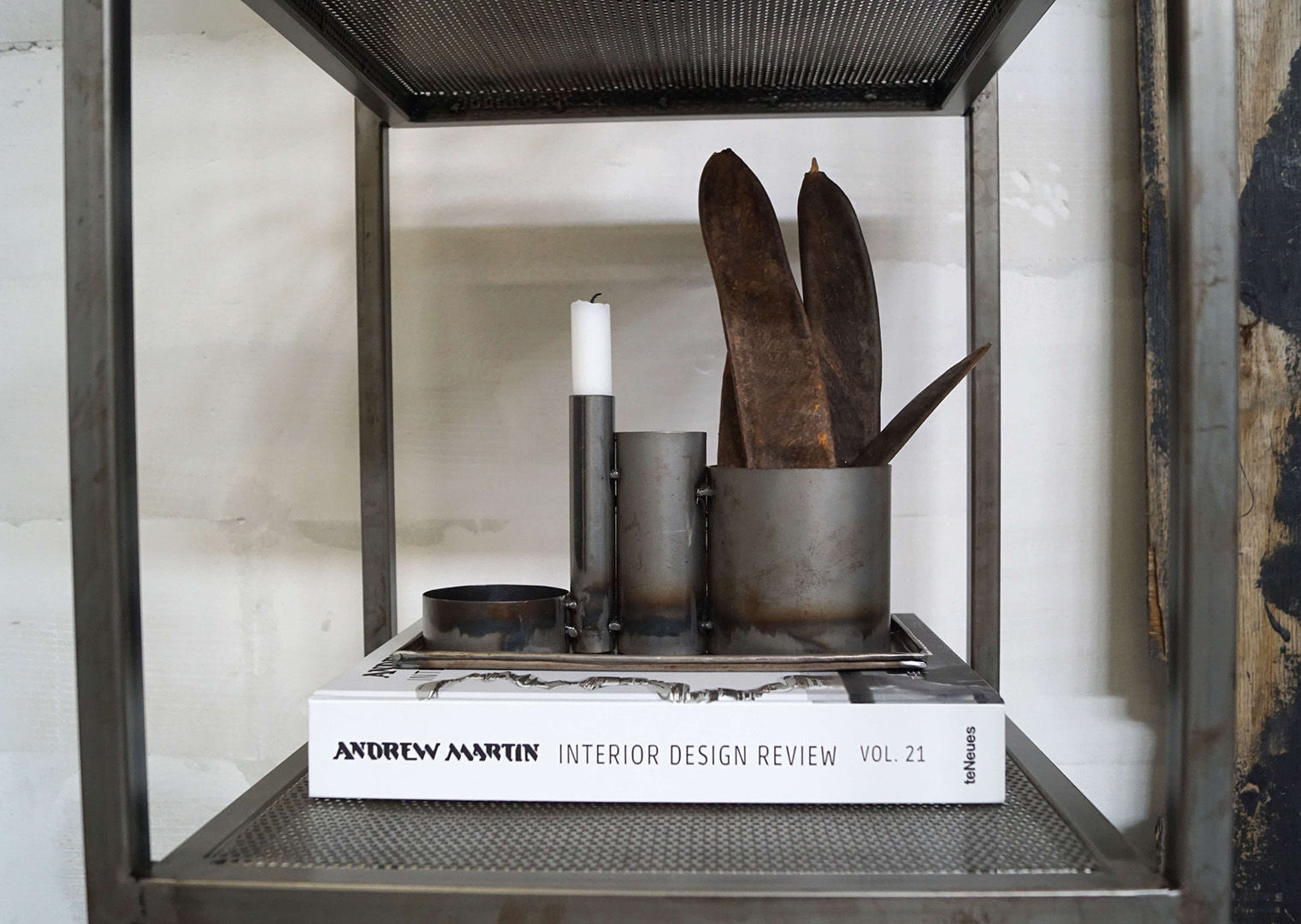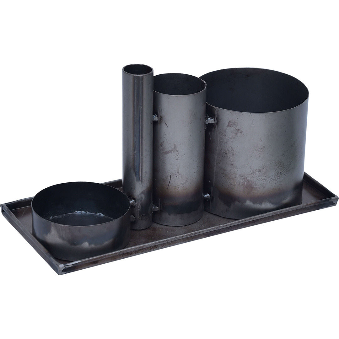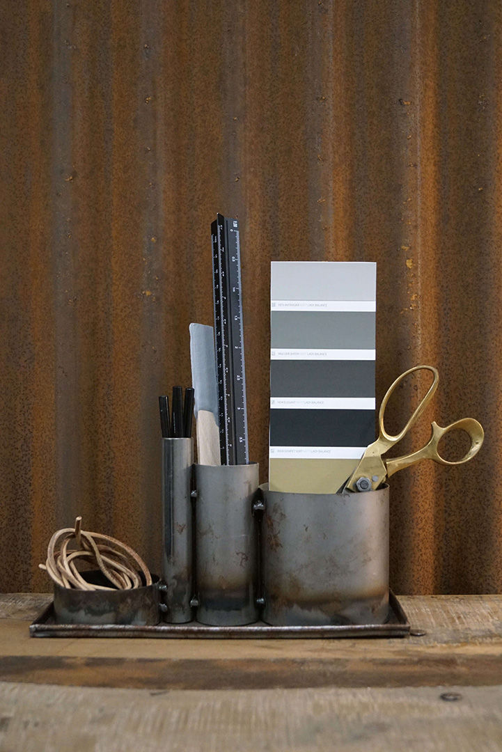 Her har du et multifunktionelt design. En jernbakke med 4 sammensvejste opbevaringpotter. Du kan bruge bakken og potterne sammen eller hver for sig, da bakken ikke er svejset sammen med potterne. Du kan bruge kreationen på kontoret til at holde styr på dine blyanter og andet kontorudstyr. I køkkenet til krydderurter, olier og krydderier. Til årets højtider, hvor du kan pynte med grene, påskepynt, julepynt eller noget helt andet. Kan også bruges på badeværelset til at holde orden i hårbørster, tandbørster, hårbånd, smykker etc. Der er så mange muligheder med denne sjove kreation.