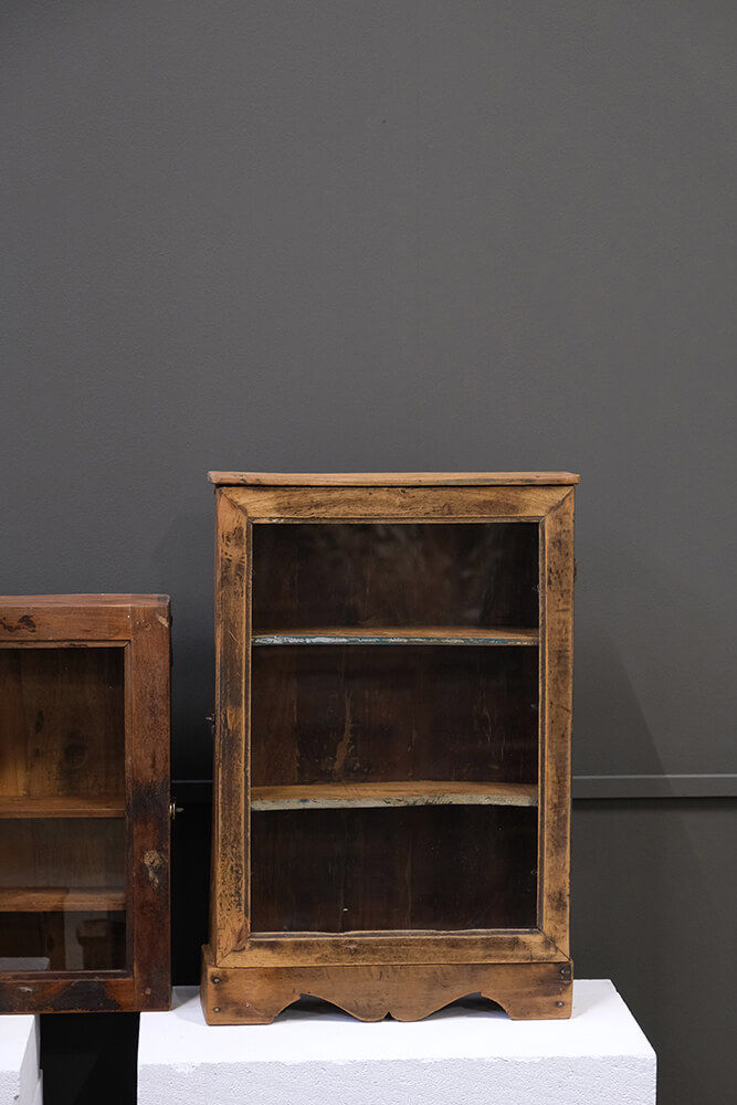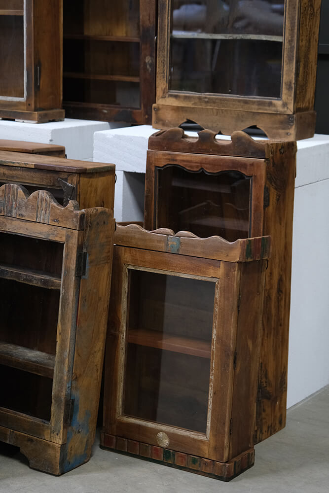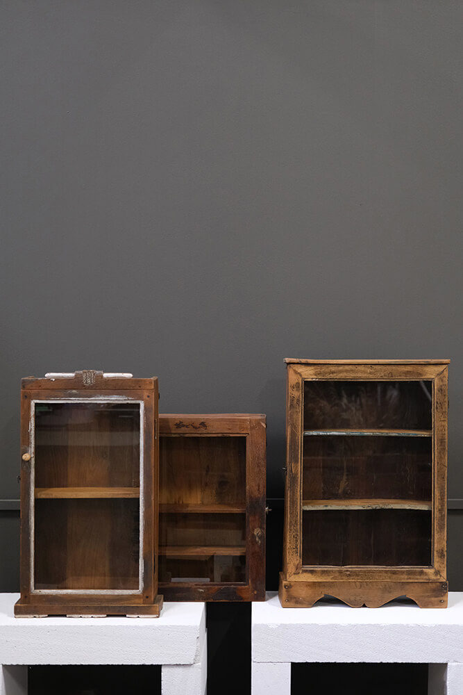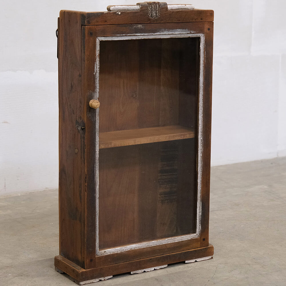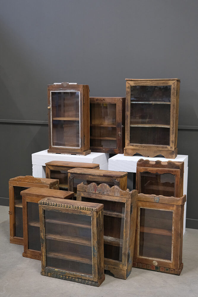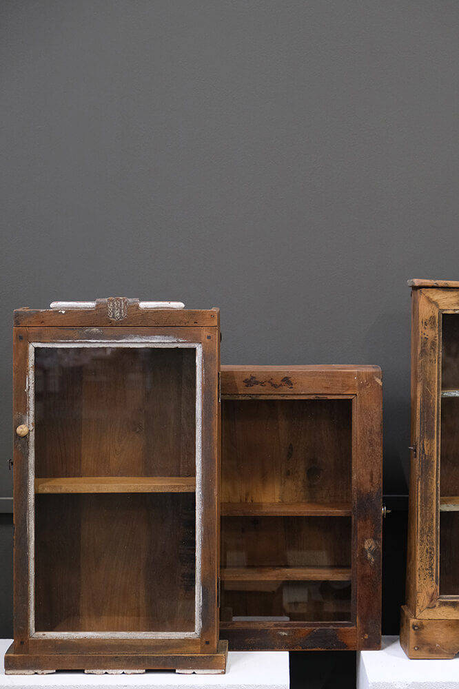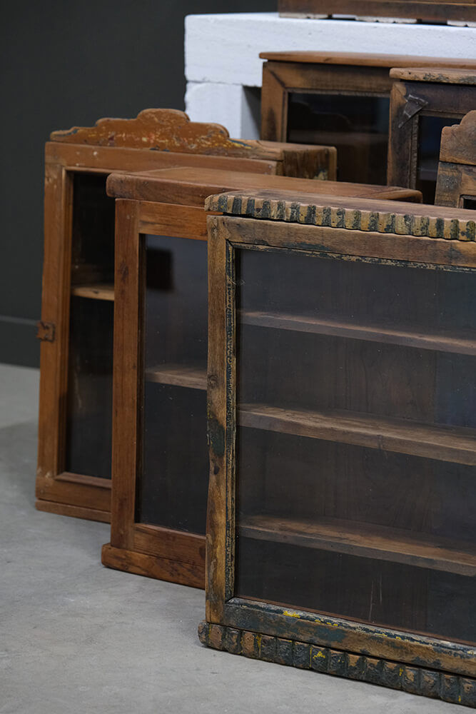 Disse gamle unika vægskabe i træ bringer historie og charme til ethvert rum. Hvert skab er unikt med sit eget naturlige udtryk, og hver sin patina og brugsspor. Vægskabene varierer i form og detaljer, alle med en autentisk og rustik karakter. Perfekt til dig, der ønsker et originalt og gammelt møbel i din indretning. Brug vægskabet som en smuk opbevaringsløsning i køkkenet, stuen eller badeværelset, hvor du kan fremvise glas, porcelæn eller små nipsting bag de enkle glaslåger.