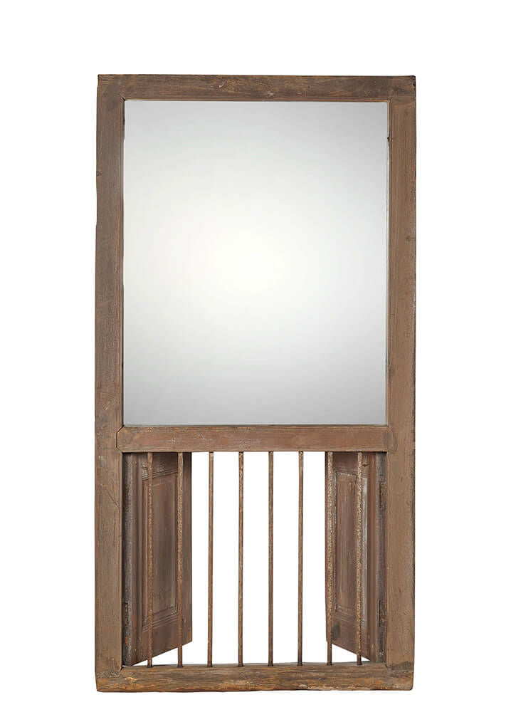 Denne skønne spejlramme er skabt af en autentisk gammel indisk dør, der emmer af historie og rå charme. Den solide trækonstruktion har en smuk patina og tydelige spor af tidligere brug, der giver spejlet en helt særlig karakter. Spejlet er monteret i den øverste del af døren, mens den nederste del fremviser de originale detaljer og udskæringer, der vidner om håndværkets oprindelse. Perfekt som et statement-møbel i entréen, soveværelset eller butikken for at tilføre rummet varme og sjæl.