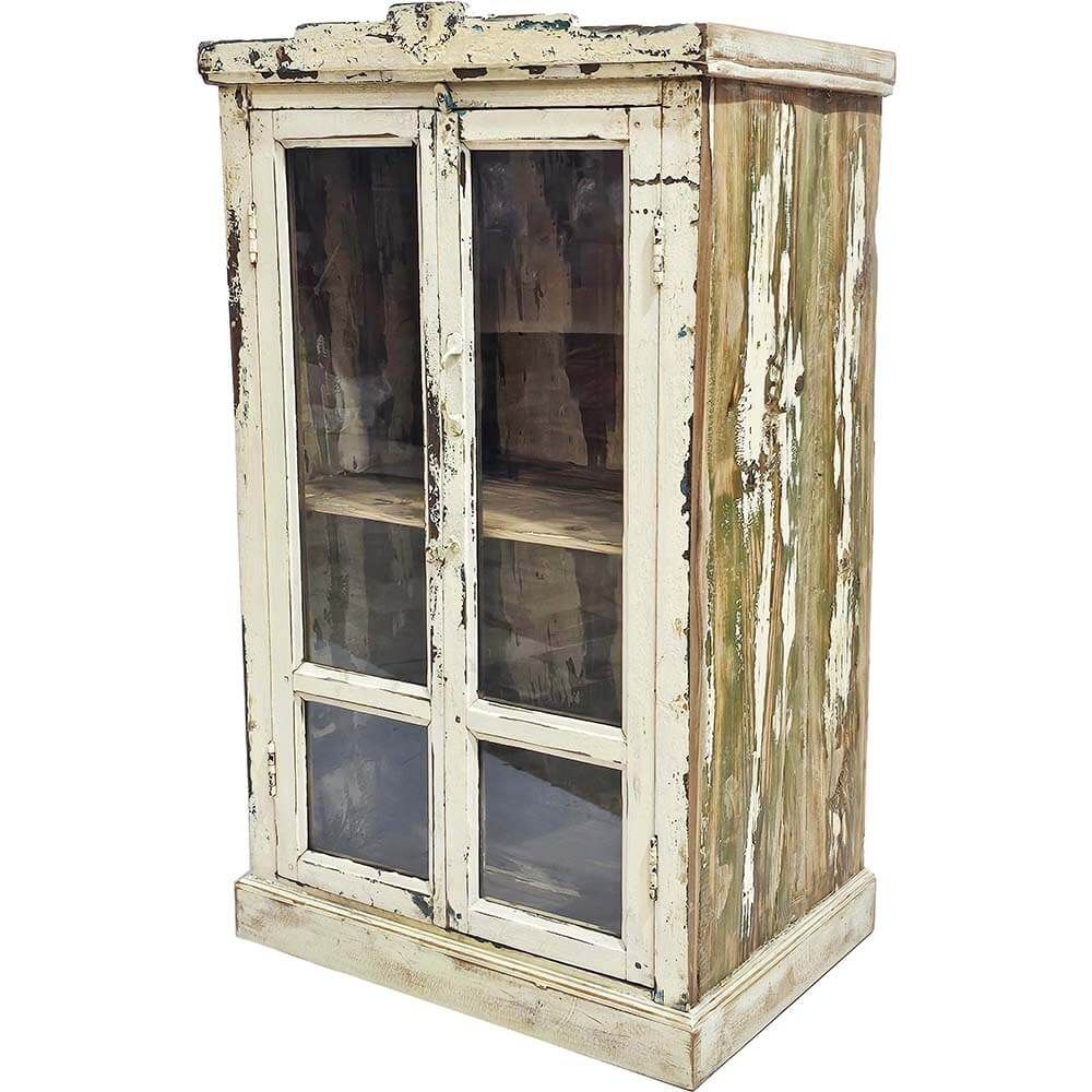 Dette charmerende vitrineskab emmer af vintage nostalgi med sin slidte cremefarvede patina og autentiske udtryk. Skabets glaslåger giver et flot indblik til skabets indhold, mens de enkle træhylder skaber en funktionel opbevaringsløsning. Siderne har en skøn, afskallet finish, der vidner om et langt liv og masser af historie. Et ideelt møbel til dig, der elsker unik indretning med kant – perfekt til caféer, butikker eller det stilfulde hjem.