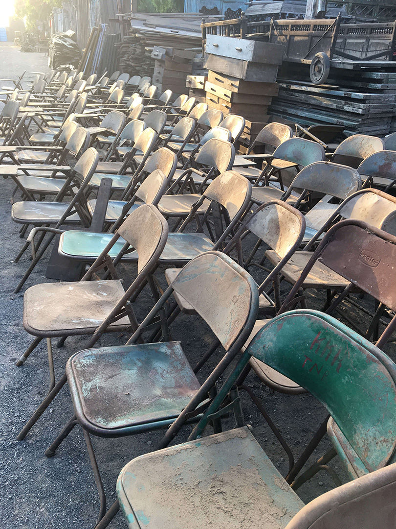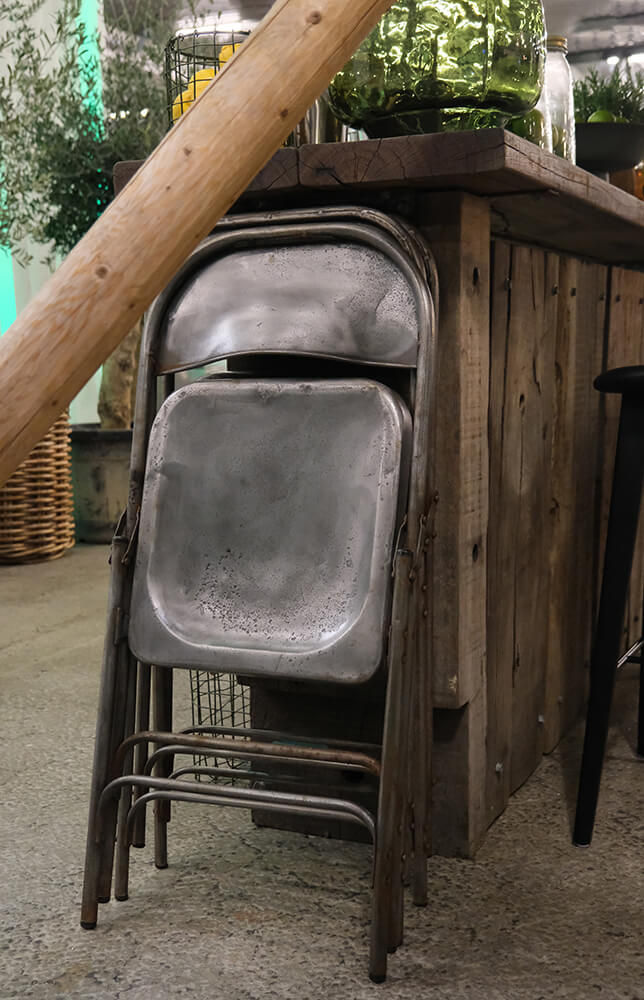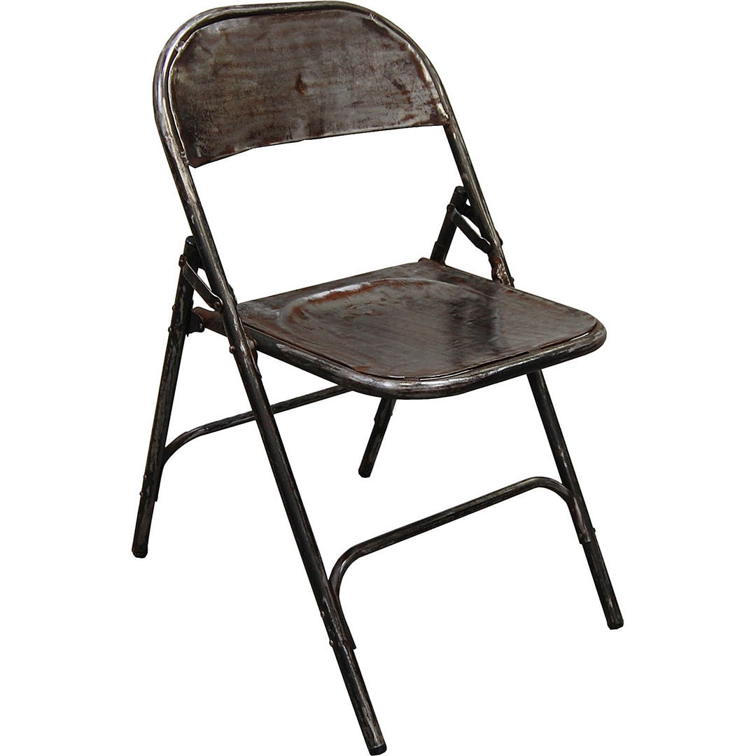 Gammel klapstol i poleret jern med unik farve og finish. Klapstole kan tilføre boligindretningen eller haven et unikt look. Klapstolen er let i både udtryk og vægt, og har haft sit tidligere liv i fjernøsten, hvor den har været brugt som kantinestol, spisebordstol eller skolestol.