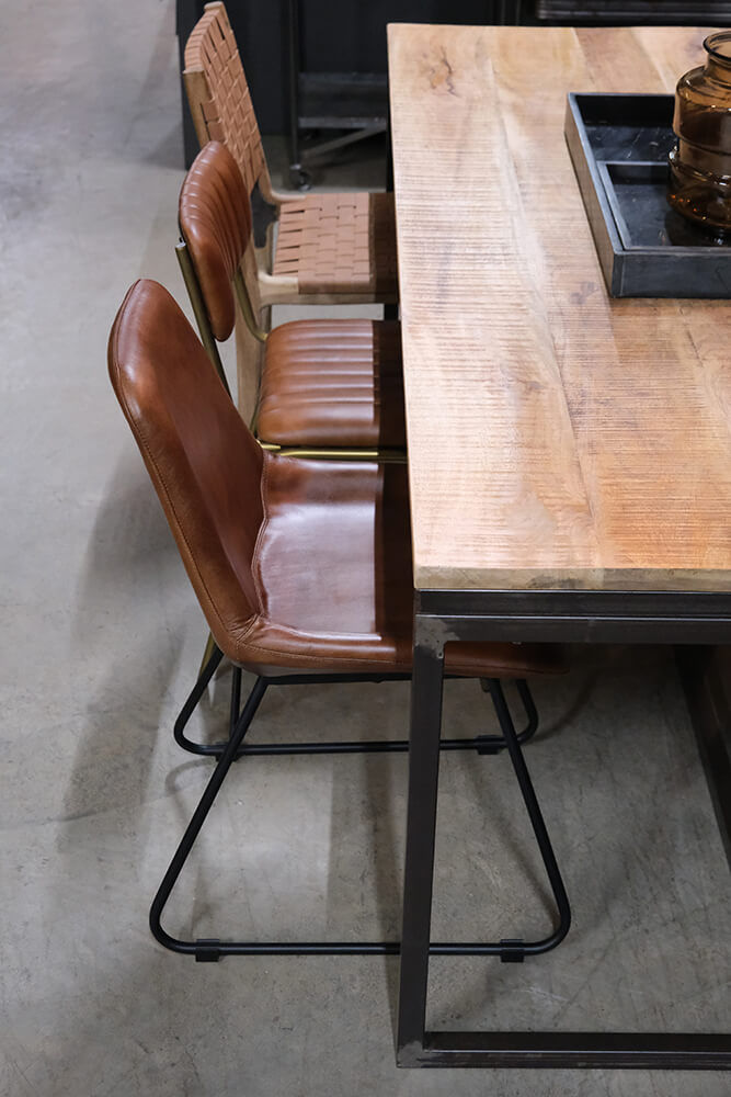 Lækker brun læderspisebordsstol med sortmalet jernstel. Du får enkelthed og komfort i denne stilfulde spisebordsstol, der er designet til at tilføre et touch af raffinement til ethvert spiseområde. Stolens skal er omhyggeligt polstret med førsteklasses bøffellæder, og den varme brune nuance skaber en indbydende atmosfære. Spisebordsstolens tidløse æstetik sikrer, at den passer smukt ind i både moderne og traditionelle indretninger.
