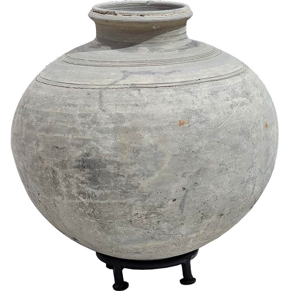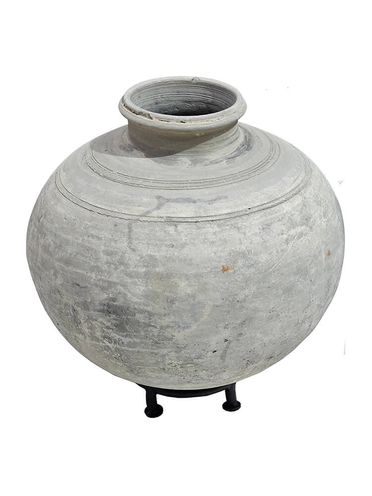 Lys lerkrukke med et enkelt og råt udtryk, der hviler med stil på en sort jernfod. Den fine patina og de smukke detaljer i leret fortæller historien om et gammelt håndværk. Jernfoden tilføjer en moderne kontrast og giver krukken en let og løftet fremtoning, der gør den velegnet til både dekorative opstillinger og som et rustikt indslag i din indretning.