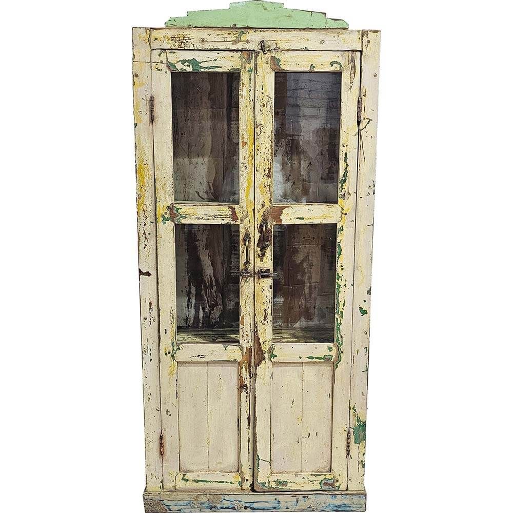 Dette unikke vitrineskab oser af historie og charme. Træskabet er håndlavet og har en flot patineret cremefarvet og grøn finish, der giver det et rustikt og autentisk udtryk. De dobbelte glaslåger sikrer, at dine udstillede genstande får den opmærksomhed, de fortjener, mens det ældede træ tilføjer en varm og personlig atmosfære til rummet. Perfekt til dig, der ønsker et møbel med sjæl – hvad enten det skal bruges i en butik, café eller hjemmet til opbevaring af smukke genstande.