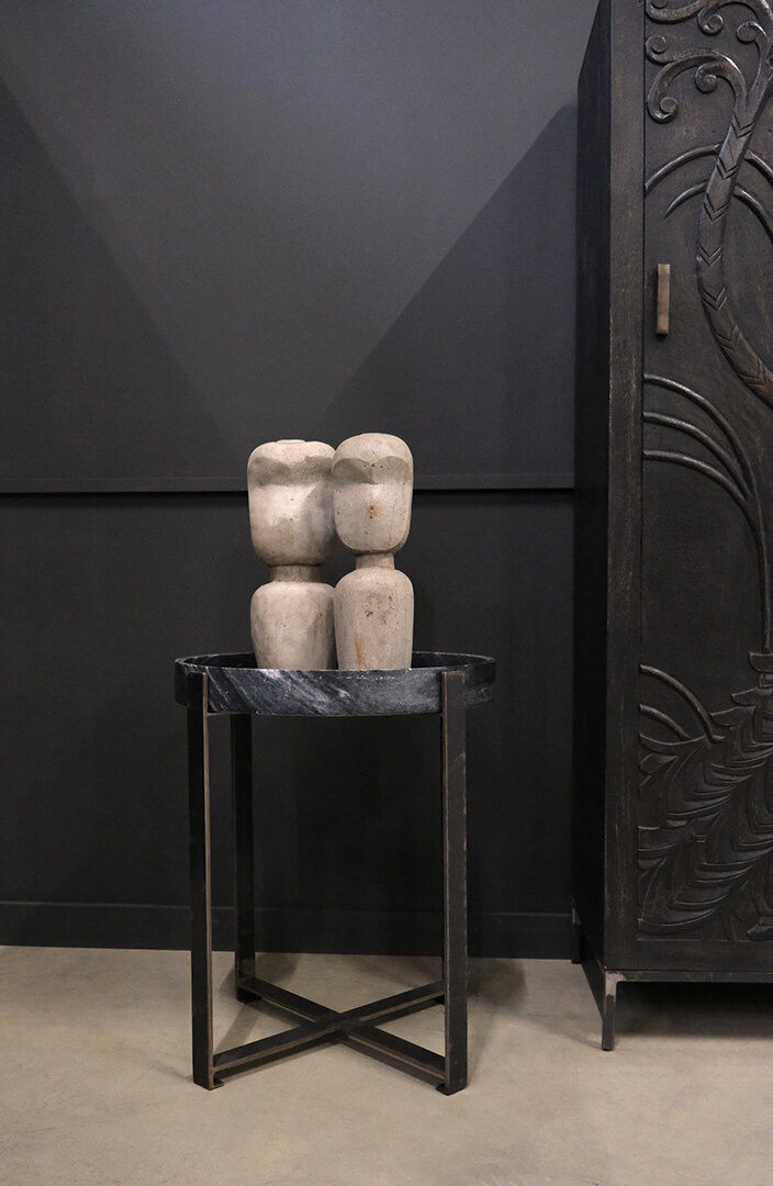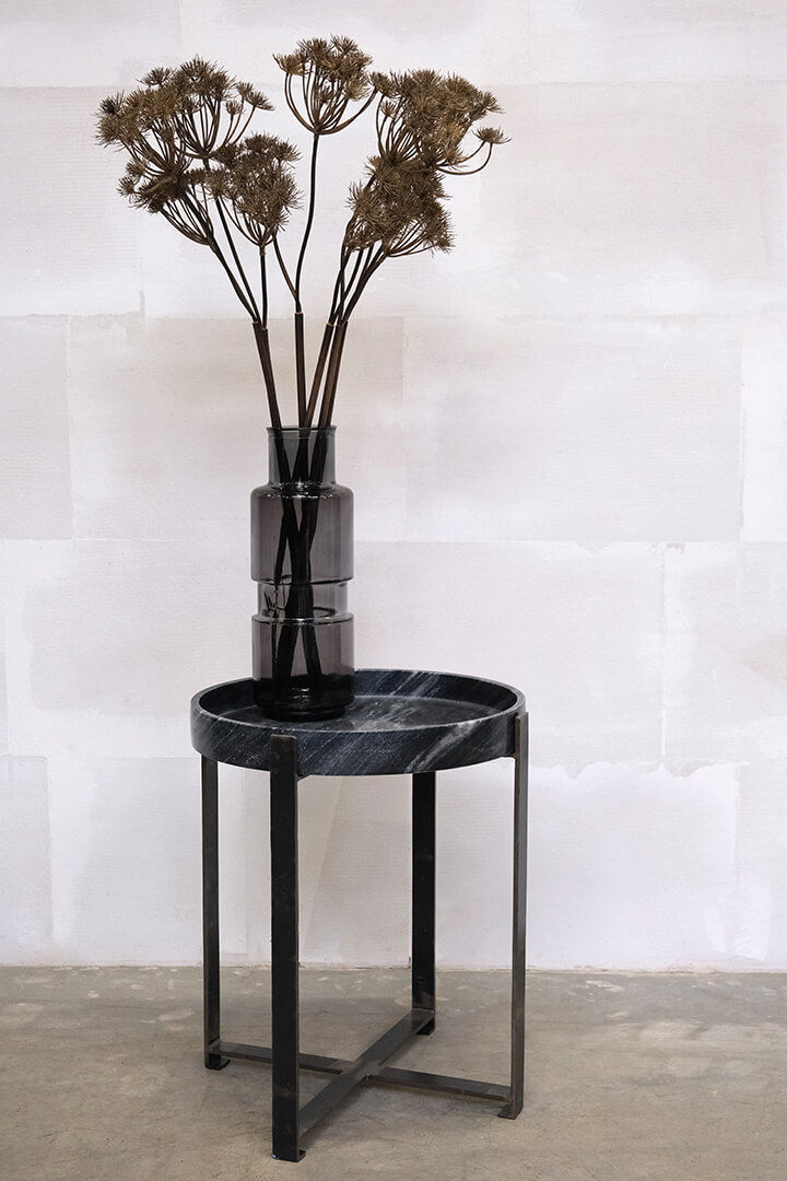 Smart og lækkert rundt bakkebord. Bakkebordet fremstår maskulint i et enkelt design med et lakeret jernunderstel og et rundt gråt marmorfad. Brug bakkebordet som et smukt sidebord i dit hjem, i din butik eller caféen. Bakken kan tages af og bruges som et selvstændigt fad. Bemærk at nuancerne i marmoren kan veksle fra lys til mørk, og derfor kan fadet afvige fra det du ser på billederne.