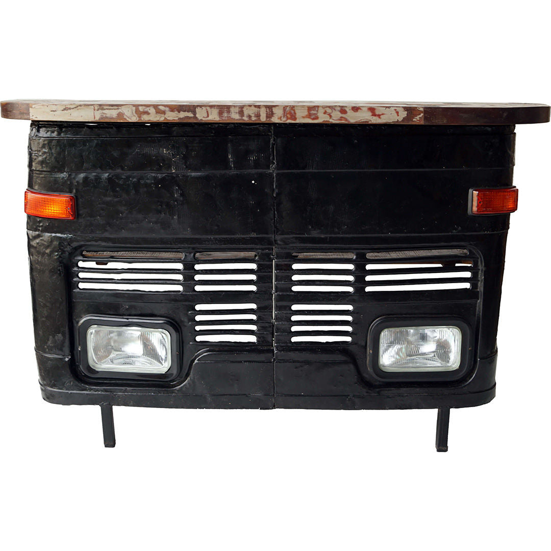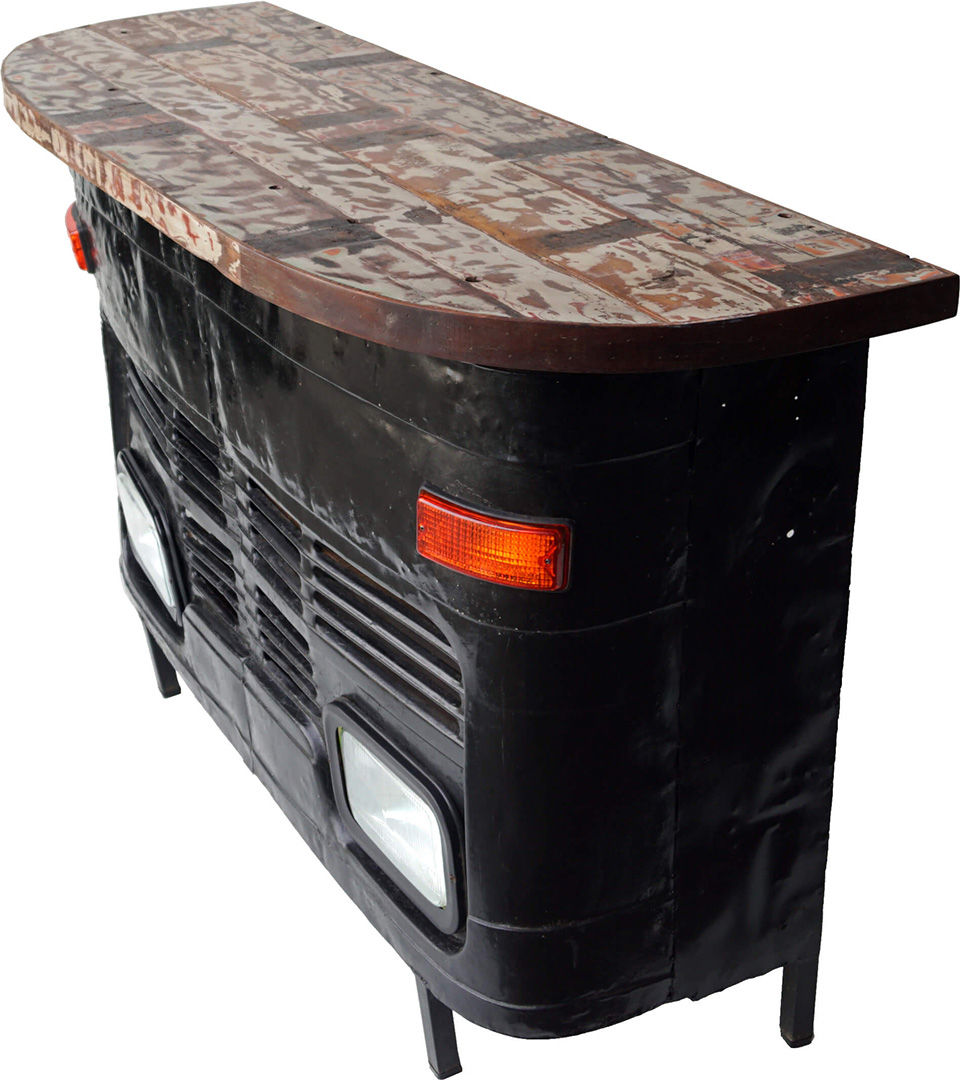 Sjov og anderledes bar med et maskulint udtryk. Baren er fremstillet af fronten fra en gammel lastbil af mærket TATA. Fronten er sortmalet og med bordplade fremstillet i genbrugstræ. Der er god plads til opbevaring, da der inde i baren er en lang hylde. Baren kan både bruges i herrerummet i din private bolig, men er også et godt blikfang i din business. Baren vil tilføre din indretning i din café, restaurant, kaffebar eller tøjforretning et sjovt og anderledes råt look. Til dig der ønsker at tilføre noget unikt til din indretning.
