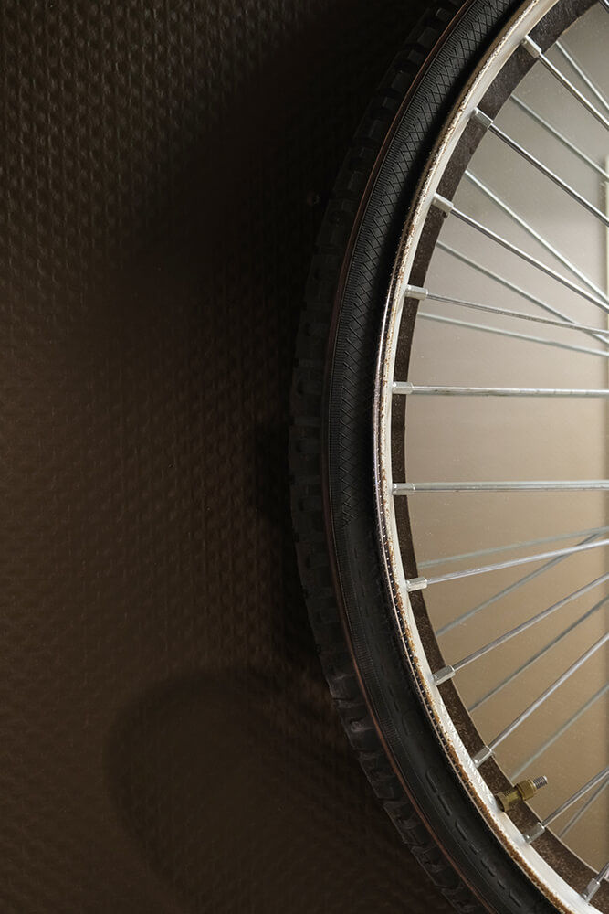 Dette cykelhjulsspejl er en sjov og anderledes detalje til din indretning. Fremstillet af et cykelhjul monteret på en solid jernramme, giver det illusionen af et klassisk hjul, men med et moderne twist. Den blanke spejloverflade bag egerne skaber et skævt look, hvor det industrielle møder det humoristiske. Perfekt til at tilføje lidt kant til væggen i stuen, entreen eller endda i en caféindretning, hvor der ønskes en rå og iøjnefaldende effekt.
