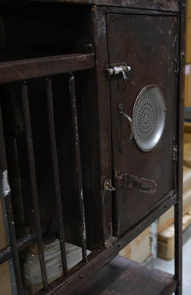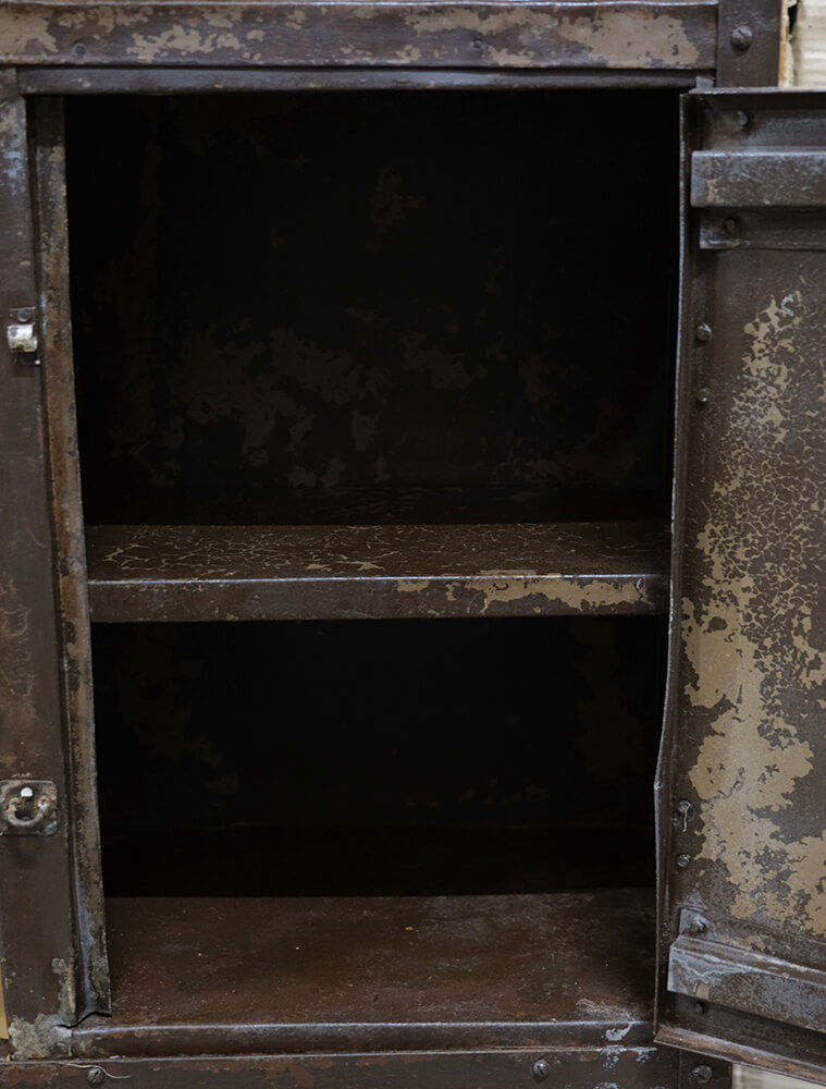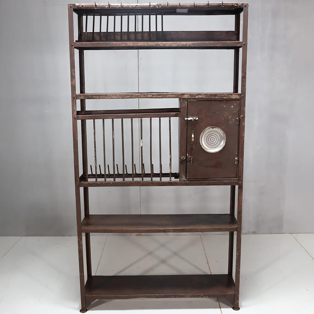 Denne gamle reol i metal har en rustik charme med sit patinerede look. Den er delt i tre sektioner med åbne hylder, en tallerkenholder og en skabslåge med et sjovt ventilationshul. Skabets rå og industrielle udtryk gør det til et iøjnefaldende møbel til ethvert rum, hvor det både kan skabe en autentisk stemning og fungere som praktisk opbevaring. Perfekt til et køkken med en rå stil eller til at give en industriel kant til en moderne indretning.