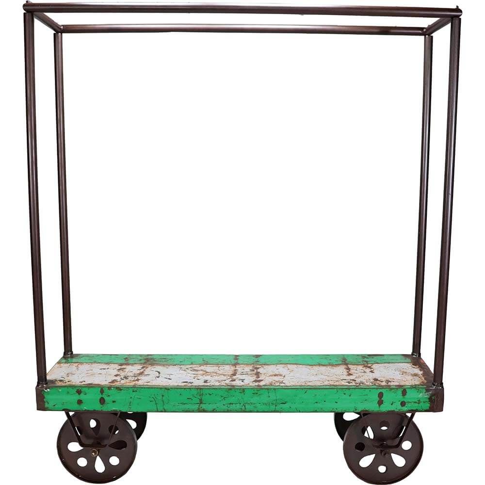 Dette rå og sjove industrielle tøjstativ i rå fabriksstil giver virkelig blikfang. Stativet er lavet af jern, som har fået en klar lak, der fremhæver dets autentiske, patinerede look. Den solide bund med grønne og hvide nuancer bærer tydelige spor af sin historie, hvilket giver tøjstativet masser af personlighed. De store, karakteristiske jernhjul understreger det industrielle udtryk og gør det let at flytte. Perfekt til en butik, et showroom eller som et råt element i hjemmeindretningen. En anderledes løsning til dig, der elsker møbler med kant og charme.