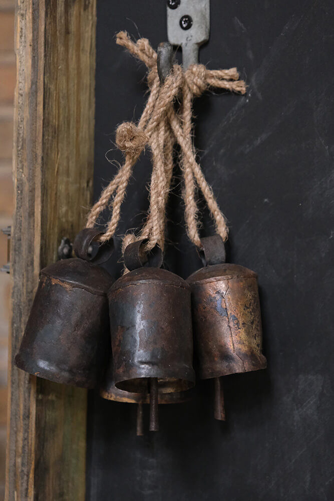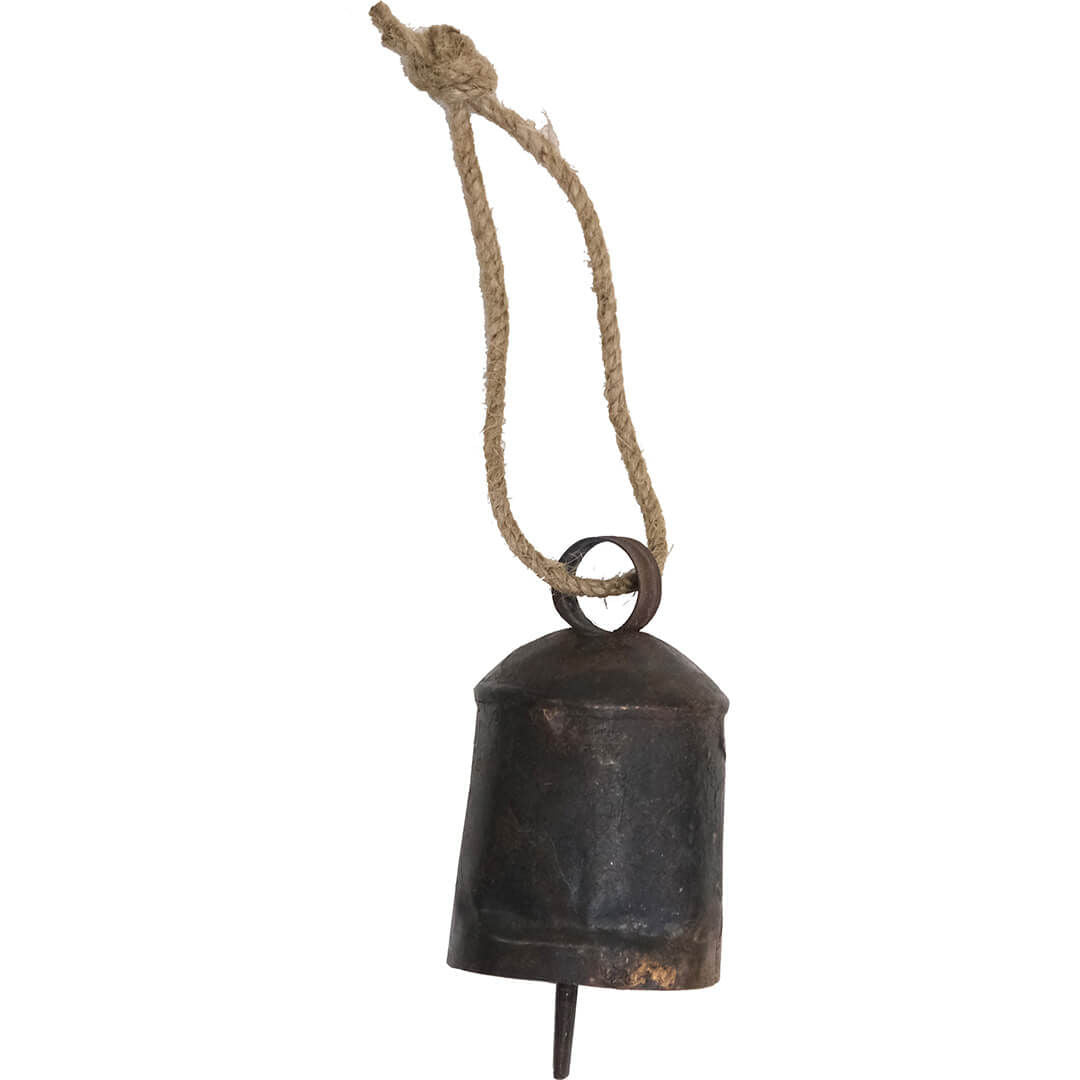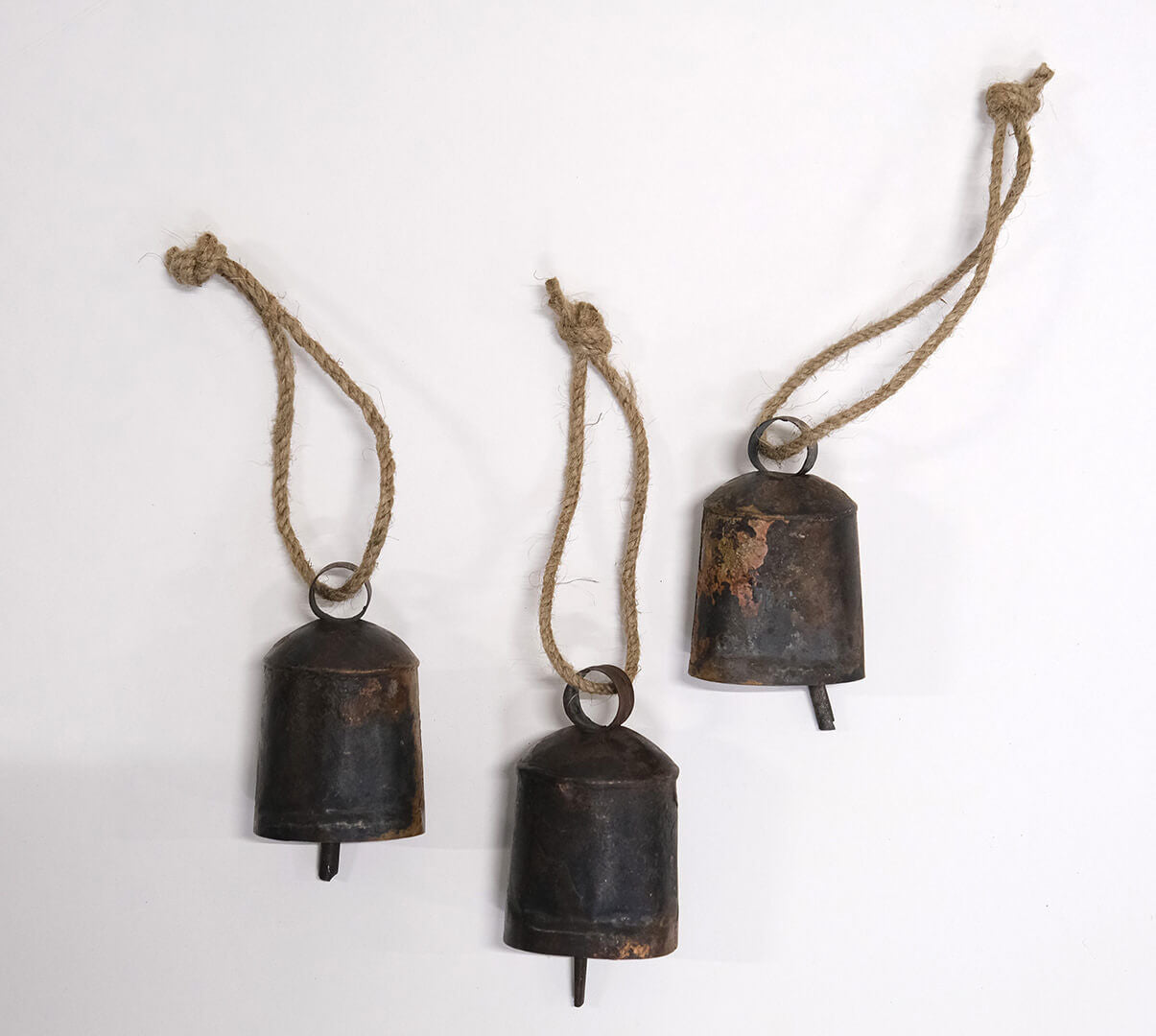 Rustikke gamle klokker i jern og med ca. 20 cm jute snor. Klokkerne bruges i Indien til at hænge på koens halsbånd. Vi har blot tilført en lille jute snor, og derved får klokken mulighed for en anden anvendelsesmulighed i din indretning. Til jul er de skønne patinerede klokker dekorative at hænge på kraftige grene.