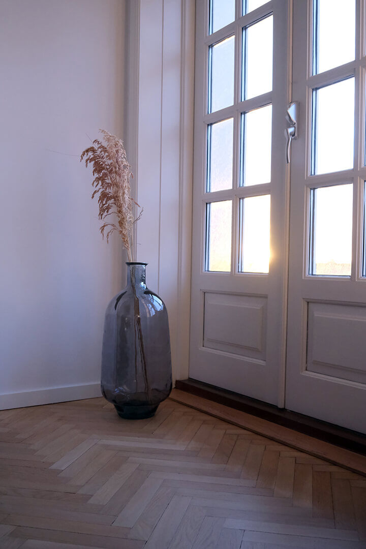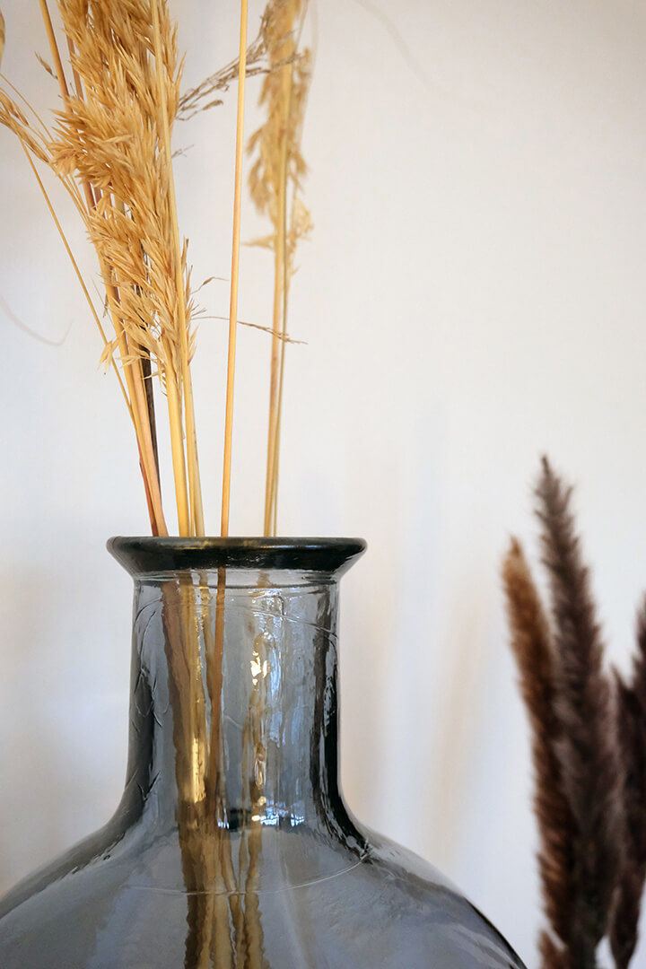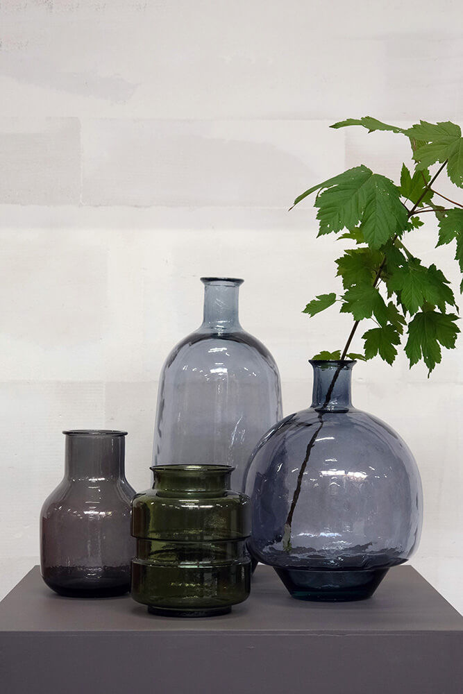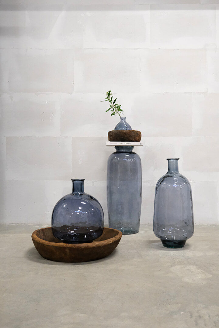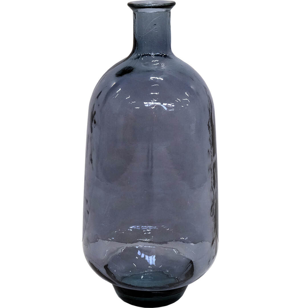 Her har du en stor smuk og flaskeformet gulvvase i havblå med en kunstnerisk balloneffekt. Den smukke gulvvase i glas er høj og slank, og kan enten stå alene eller sammen med andre vaser og krukker i andet materiale. Denne gulvvase på 60 cm er perfekt til årstidens grene eller tørrede blomster. Med en smuk gulvvase som denne kan du tilføre din indretning en sofistikeret og lækker stil. Vasen er lavet af 100% genbrugsglas, og der kan derfor forekomme små bobler og mindre ujævnheder i glasset.