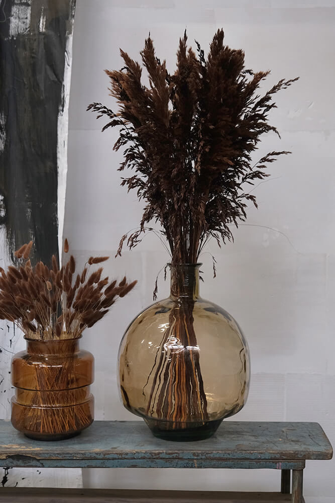Joy vasen i røgfarvet er en smuk glasvase med en flot organisk form. Vasen er 40 cm høj, og er derfor ideel til gulvvase. Du kan sætte den alene eller sammen med andre vaser som en flot opsigtsvækkende udstilling. Glasvasen kan pyntes med årstidens smukke grene. Vasen er lavet af 100% genbrugsglas, og der kan derfor forekomme små bobler og mindre ujævnheder i glasset.