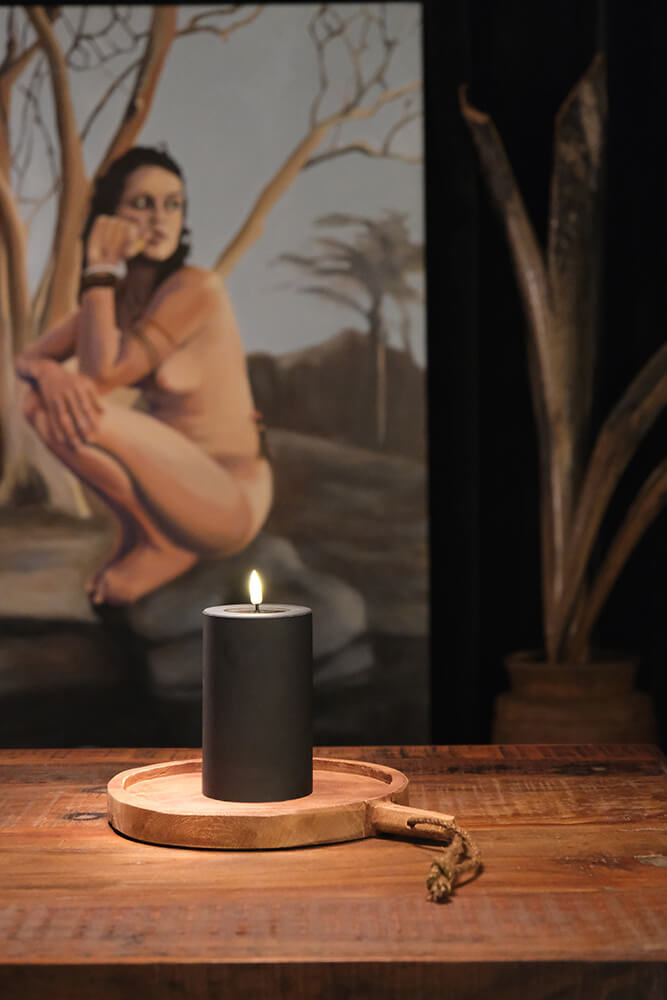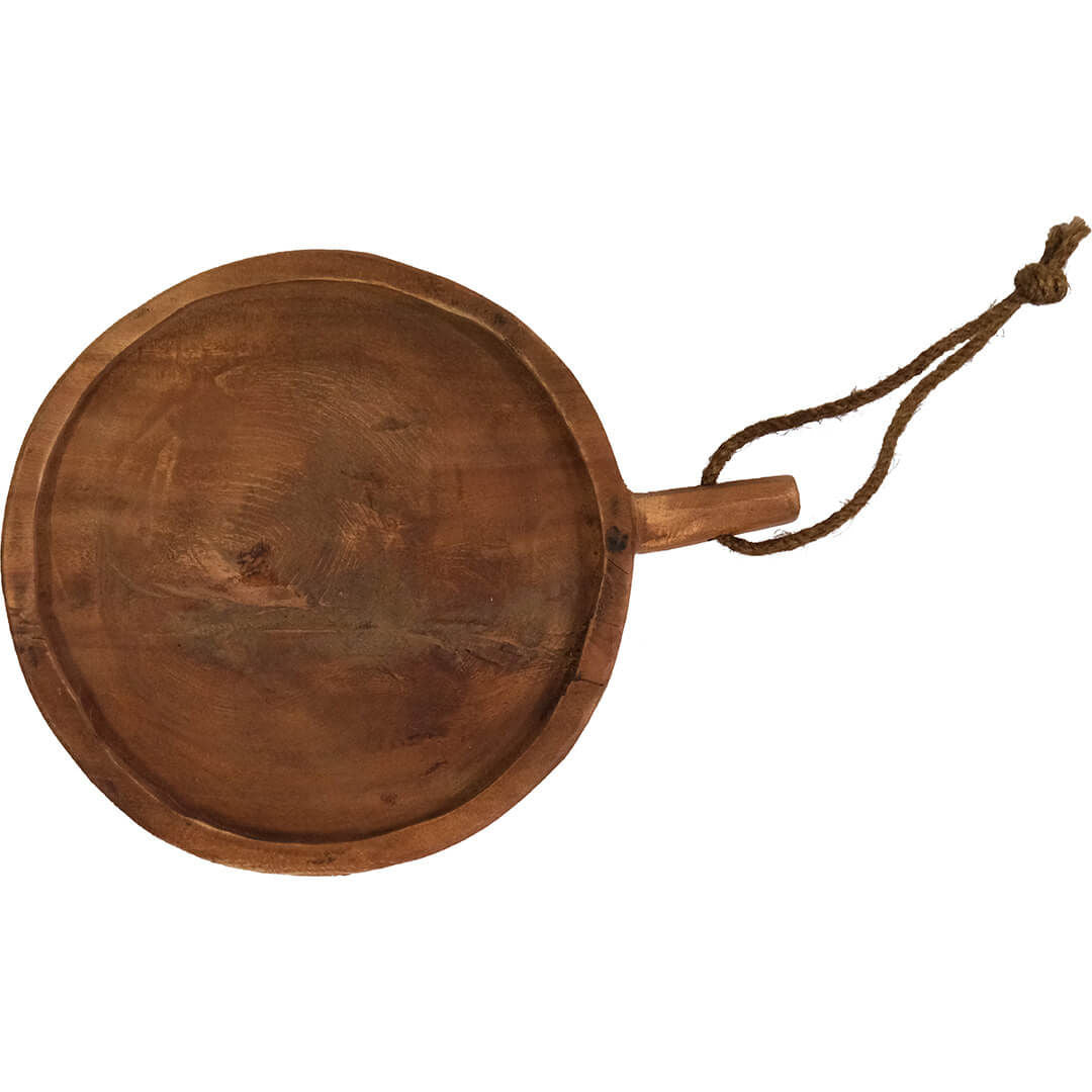Rundt serveringsbræt i træ. Giv dine gæster en inspirerende madoplevelse med en rustik og anderledes anretning. Dette serveringsbræt kan løfte præsentationen af f.eks. en god tapas, sushi eller bagværk. Brug vand og sæbe til rengøringen, og forlæng holdbarheden ved at smøre brættet med vegetabilsk olie. Opvaskemaskine anbefales ikke.