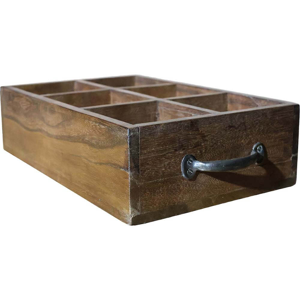 Denne robuste trækasse med seks praktiske rum og to håndtag i metal er både funktionel og dekorativ. Trækassen er lavet af genbrugstræ, og har en naturlig patina og et autentisk, rustikt udtryk. Kassen er perfekt til opbevaring af småting, olier eller kontorartikler og kan nemt flyttes rundt takket være håndtagene. Hvert rum giver god organisering og tilføjer samtidig et strejf af rå charme til din indretning, hvad end det er i køkkenet, kontoret eller restauranten.