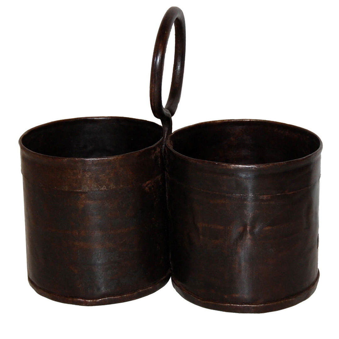 Her har du en enkelt dekorativ og rustik dobbelt bøtte/potte fremstillet i jern med hank. Bøtten har et utal af anvendelsesmuligheder. Du kan bruge den i køkkenet til bestik, krydderurter, kaffekapsler og køkkentøj. På kontoret kan du bruge den til opbevaring af dine skriveredskaber og mindre kontorartikler. I badeværelset kan du bruge bøtten til opbevaring af hårbørster, tandbørster, makeup eller hårelastikker. I dit orangeri vil disse flotte potter være perfekte til alle mulige former for planter. Du skal være opmærkom på, at potten ikke er vandtæt, hvorfor du skal fore den med plastik eller stille en lille vandtæt indsats i den. Bemærk at den angivne højde er inkl. ophæng. Selve bøtterne er 11 cm høje.