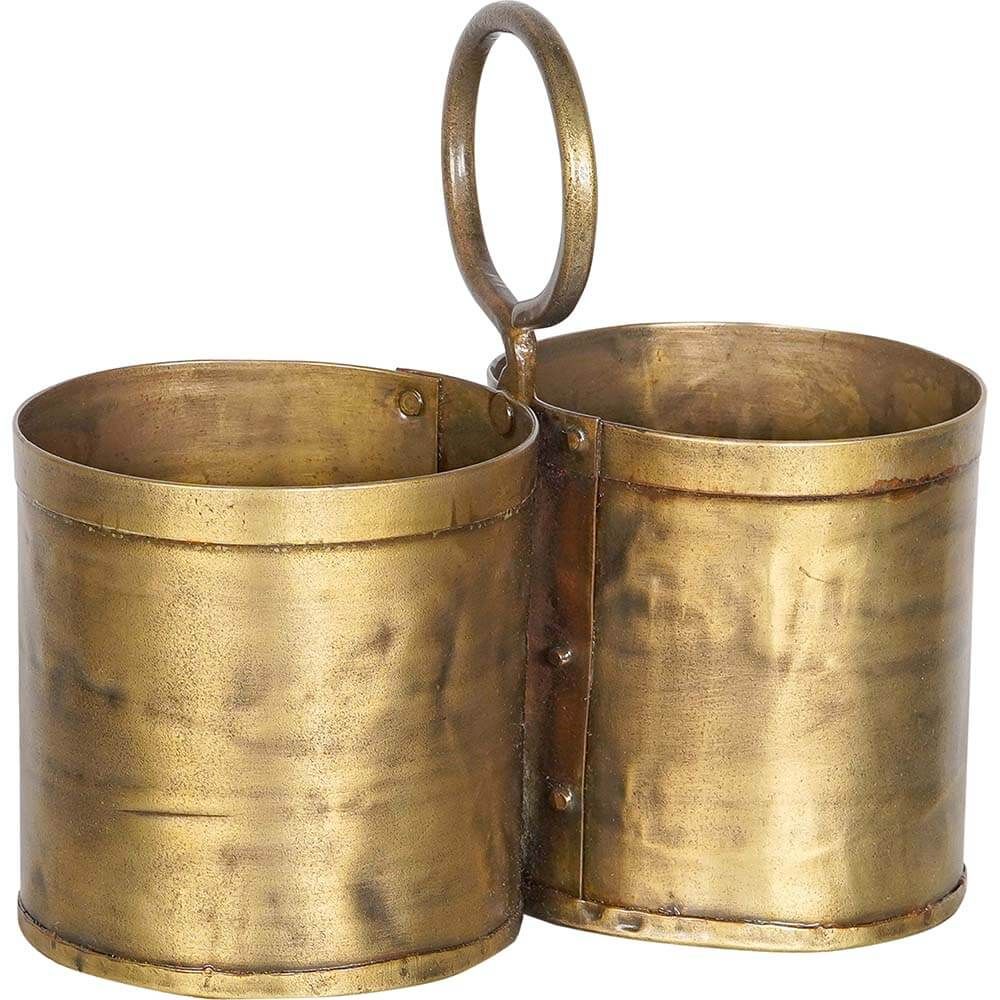 Denne charmerende bestikholder i messingfinish kombinerer funktionalitet og et udtryk med kant. De to rum er perfekte til at organisere bestik eller køkkenredskaber, mens den praktiske ring gør den let at flytte rundt. Det håndlavede look og den varme messingfinish giver et strejf af vintage-stil, der passer perfekt til både rustikke og moderne indretninger. Brug den på spisebordet, køkkenbordet eller som en dekorativ opbevaringsløsning til kontorartikler eller småplanter. En alsidig og stilfuld detalje til ethvert rum.