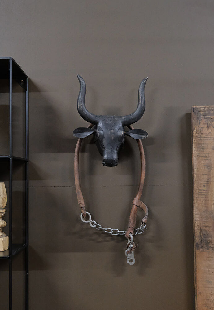 Originale gammel ko-halsrem, hvor jernet og læderet har fået den hel perfekte patina. Til en cool og unik indretning - brug den til dekoration eller ophæng. Den er også serdeles egnet til tøjbutikken, hvor den kan tilføre noget sjovt og råt til eks. jeansafdelingen.