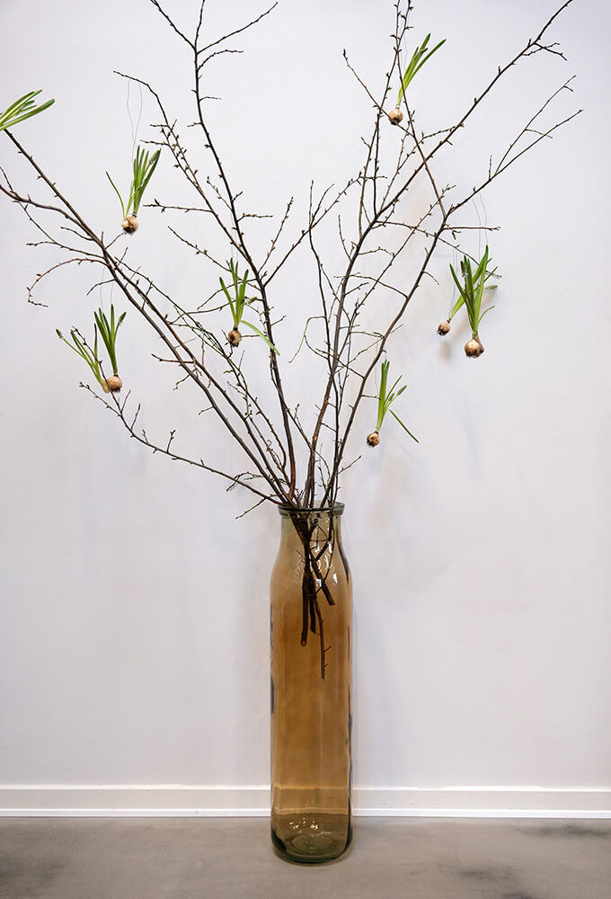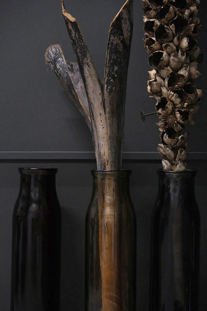 Denne høje gulvvase i røgfarvet genbrugsglas er en skønhed i sig selv. Med sin slanke og stilfulde form bringer den et element af elegance og raffinement til enhver indretning. Højden gør den perfekt til at fremvise lange stilkblomster eller grene, og den slanke form gør at du nemt kan finde plads i din indretning. Vælg denne vase for at løfte dit rum til nye højder af skønhed og bæredygtighed.