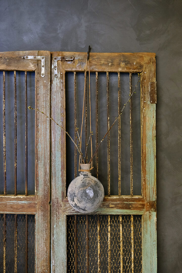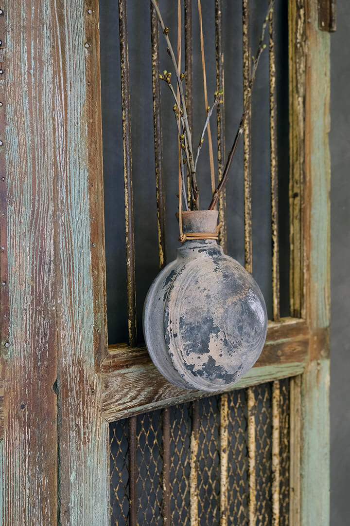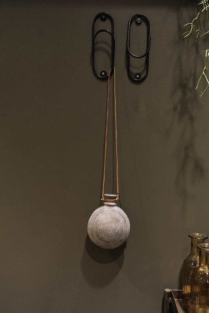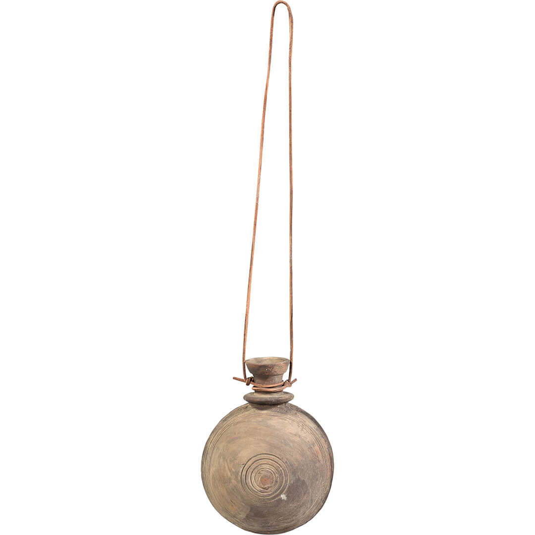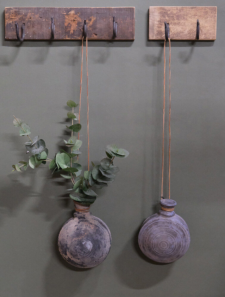Original, smuk, gammel lerflaske med fint mønster. Flasken har mange år på bagen og vi kan derfor ikke garantere at den er vandtæt, men den er superdekorativ i sig selv og vil også være så fin med tørrede blomster eller græs. Hæng flasken på væggen i lædersnoren og hæng gerne flere sammen, som en dekorativ vægudsmykning.