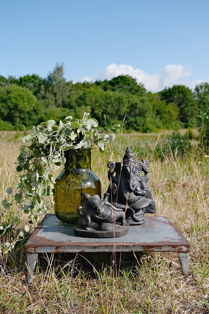 Liggende, håndlavet Ganesha lerfigur. Guden for visdom, intelligens, held og skæbne, husstanden m.m. Den folkekære gud med det ikoniske elefanthoved tilbedes på tværs af Indien og er kendt som ”Den der fjerner alle hindringer”. Med sin løftede højre hånd, velsigner Ganesha sine tilbedere med hjælp og beskyttelse.