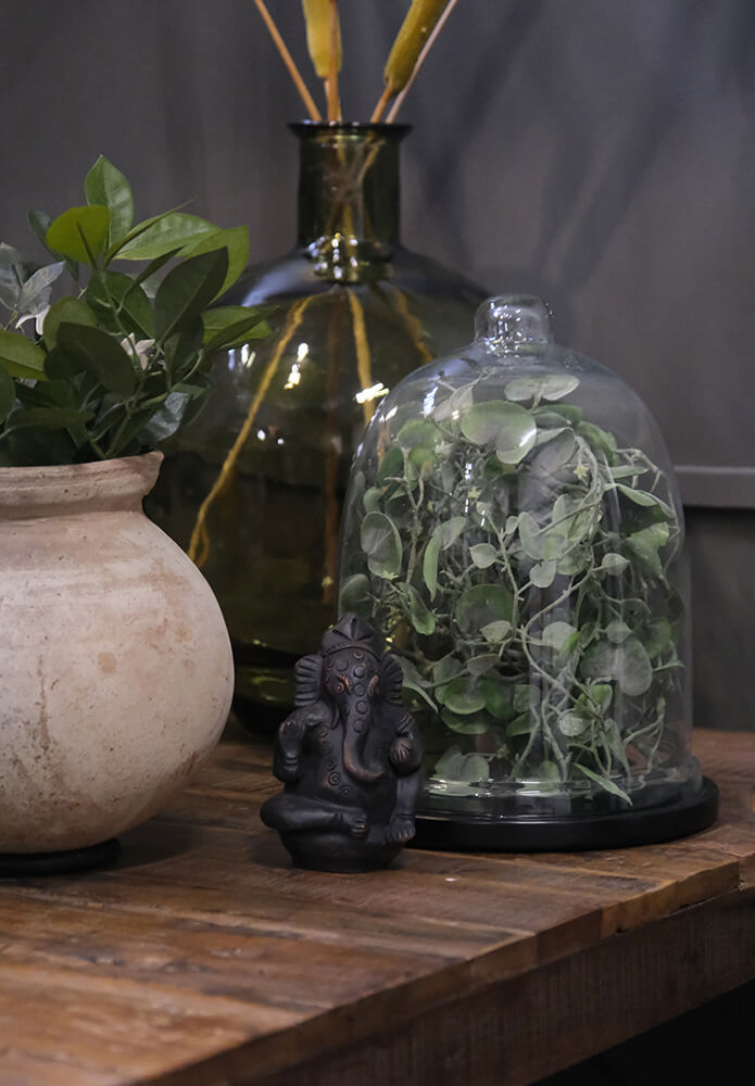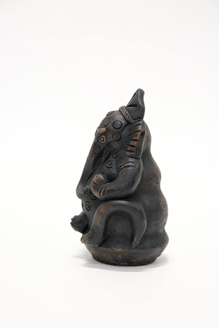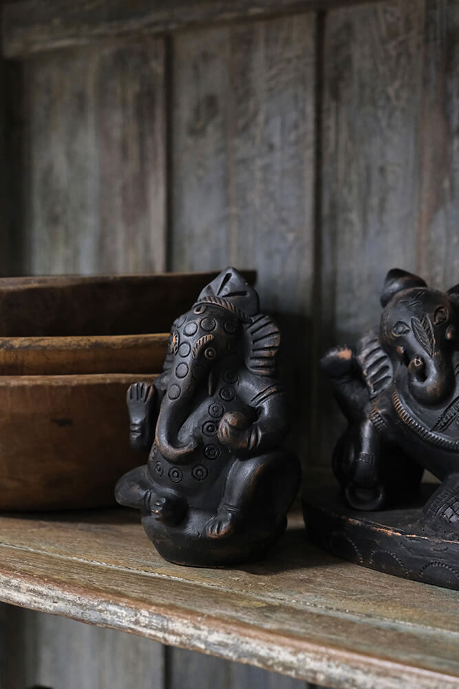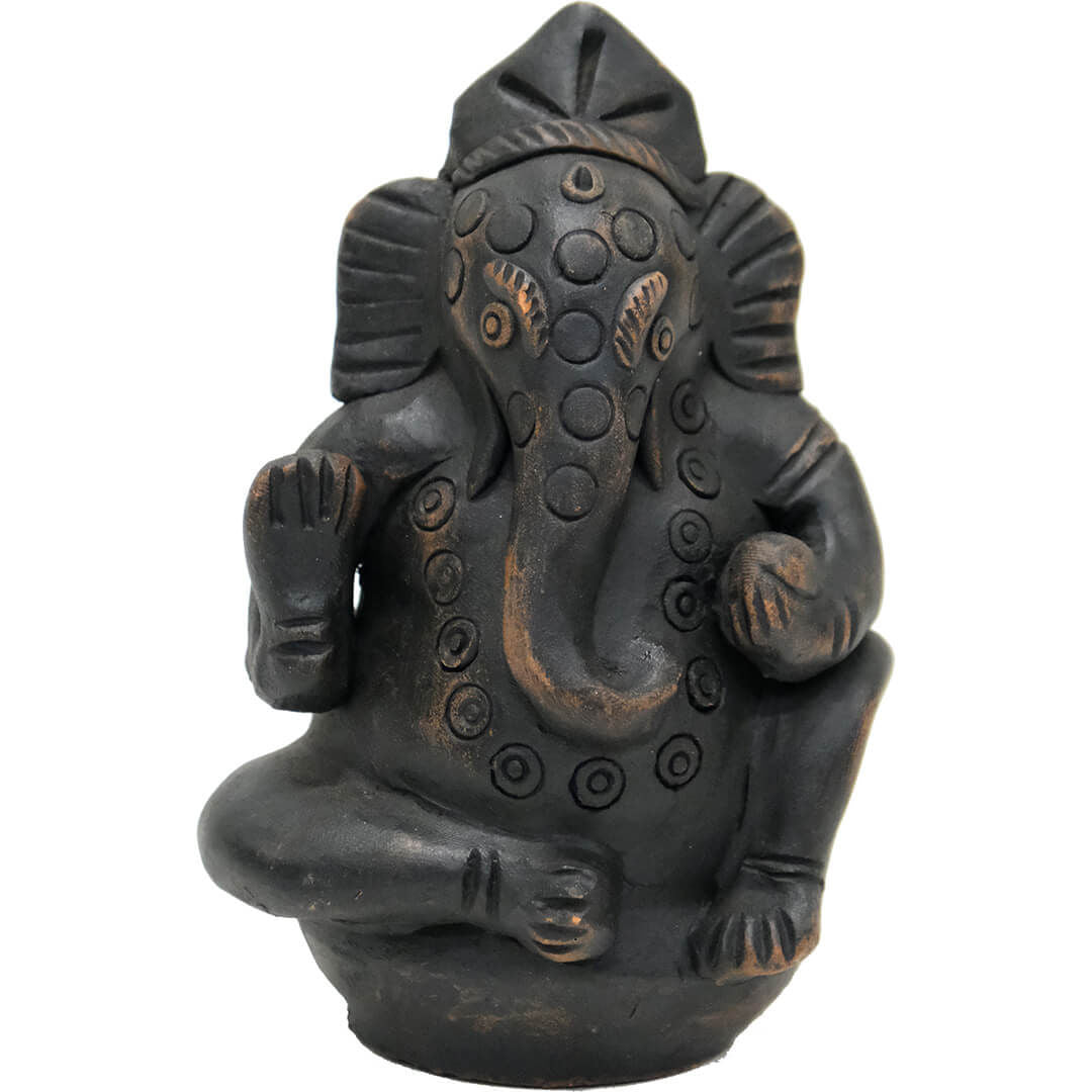 Lille Ganesha lerfigur. Guden for visdom, intelligens, held og skæbne, husstanden m.m. Den folkekære gud med det ikoniske elefanthoved tilbedes på tværs af Indien og er kendt som ”Den der fjerner alle hindringer”. Med sin løftede højre hånd, velsigner Ganesha sine tilbedere med hjælp og beskyttelse.