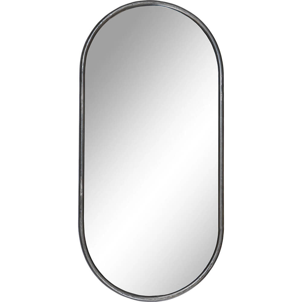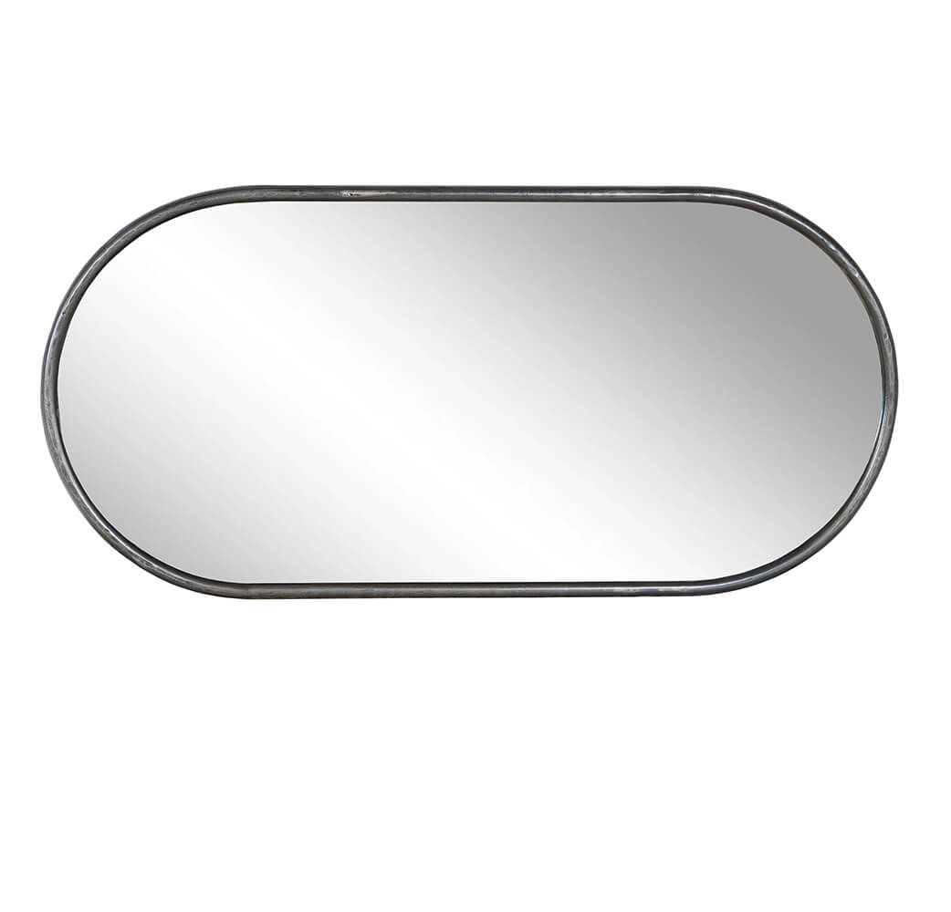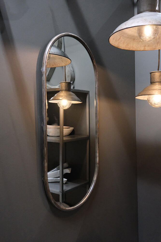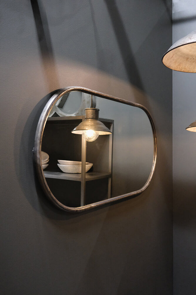 Cool og råt ovalt vægspejl med klarlakeret jernramme. Spejlet har ophæng så det både kan hænges vertikalt og horisontalt. Du kan derfor placere det f.eks. over håndvasken på dit badeværelse eller et sted hvor du ønsker en skænk under det f.eks. i entréen.