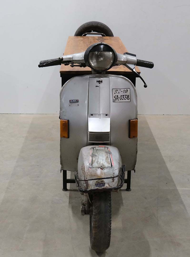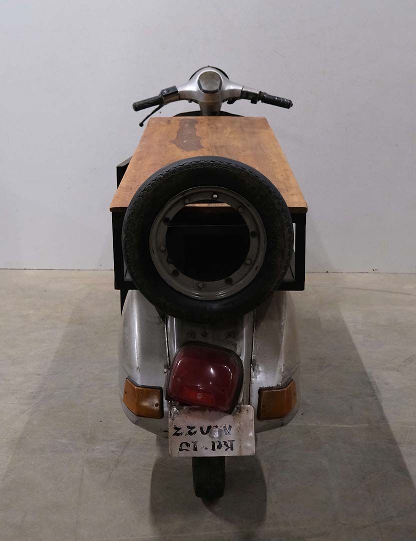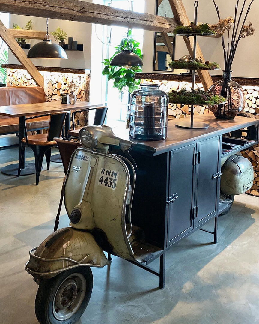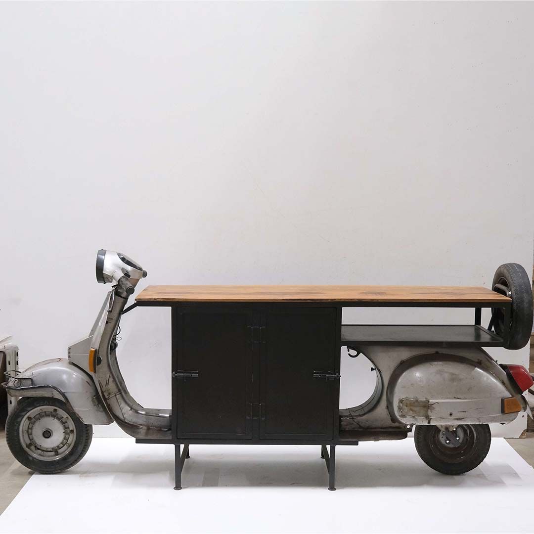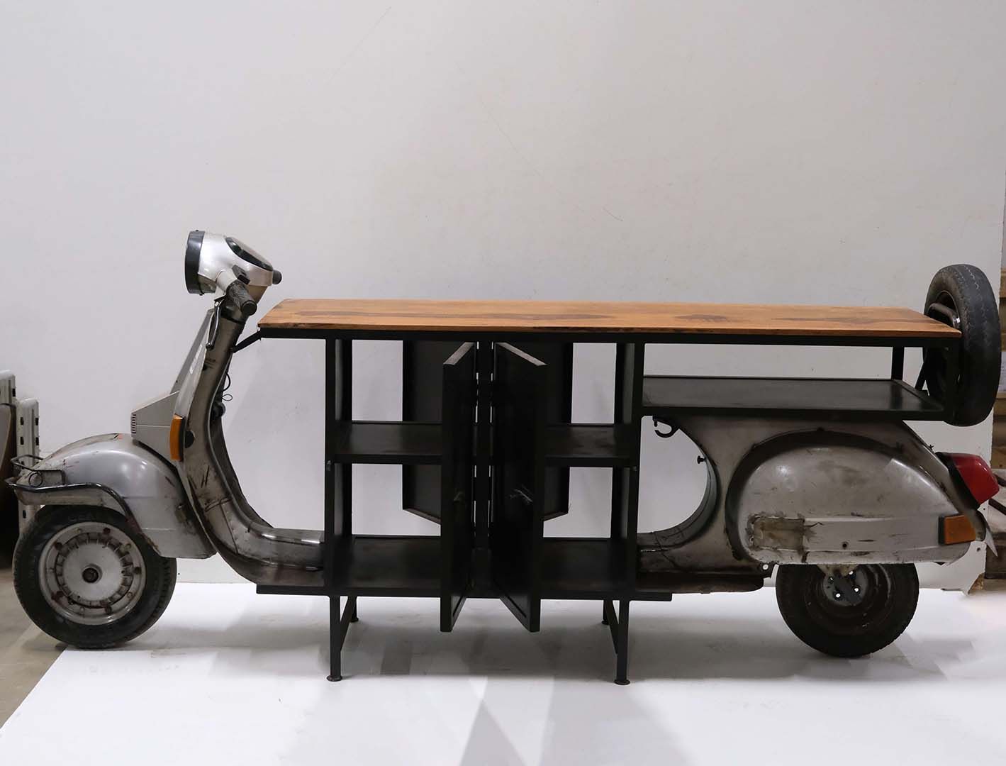 Ud at køre med de skøre.... Upcycling på den fede måde. Her har vi brugt en udbrændt scooter og forvandlet den til en sjov og anderledes bardisk. En rigtig eyecatcher der både er praktisk og vil tilføre din indretning en sjov historie. Bardisken vil være ideel i din cafe eller i din restaurant, og kunne også være perfekt at stille i firmaets kantine. Disken har to jernlåger på hver side og en gennemgående bundhylde og midterhylde i jernskabet. Billederne taler for sig selv. Du skal være opmærksom på, at når du bestiller sådan et barbord, kan der være stor forskel på farven og finish af scooterdelen, samt toppladen der er af genbrugstræ. Mål på topplade: 167 cm lang og 49 cm i dybden samt 89,5 cm. i bordpladehøjde.