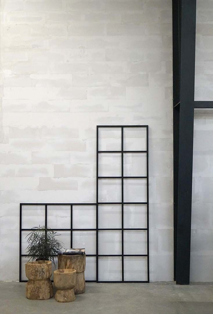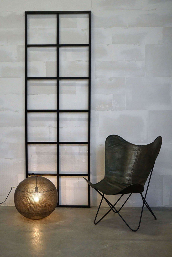 Stor skillevæg i et moderne enkelt design. Skillevæggens stel er i jern men UDEN glas. Skillevægge er et af tidens populære indretningstrends, og med vores skillevæg får du både den praktiske effekt og et smukt enkelt udtryk. Kommer uden beslag. Rådfør med en tømrer, hvordan den kan monteres.