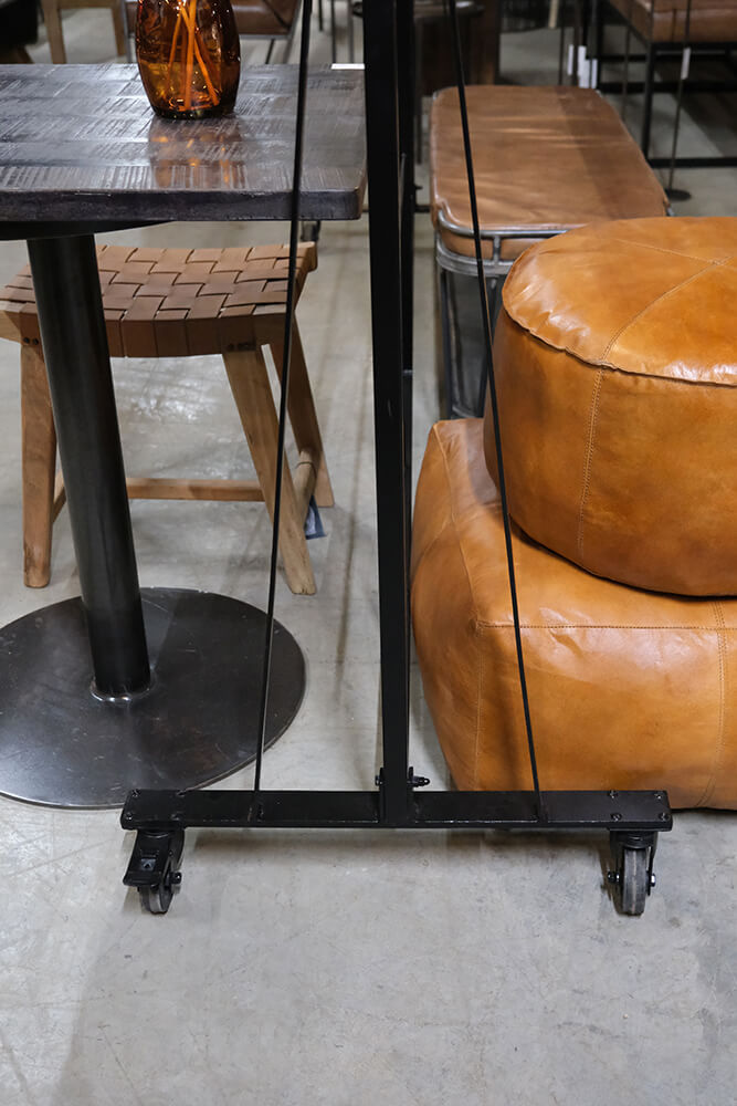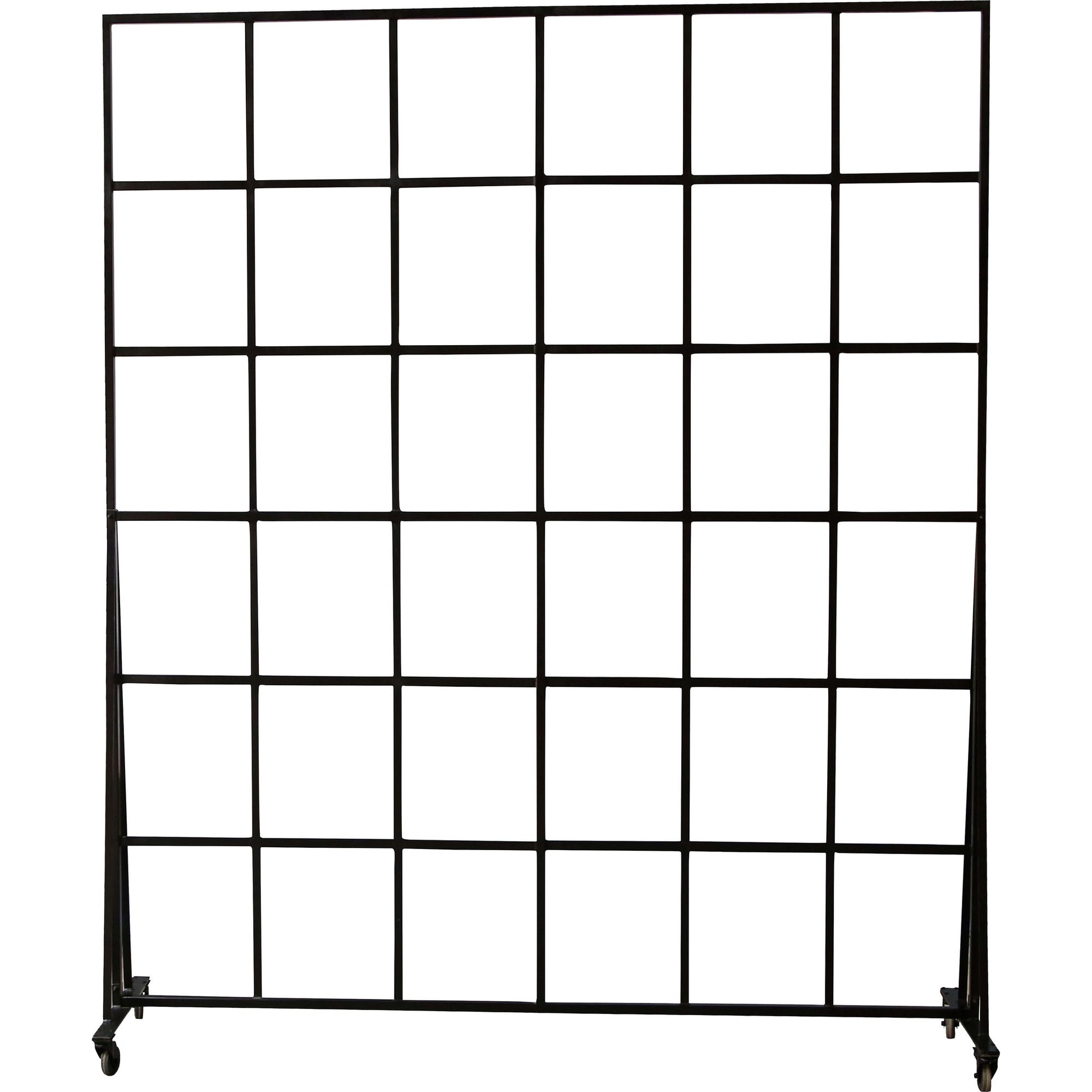 Flot, rå og praktisk skillevæg med hjul. Skillevæggen har et kvadratisk design med et sort jernstel uden glas. Denne skillevæg er genialt, når du ønsker en fleksibel ruminddeling, da hjulene gør at du kan flytte den rundt i din butik eller restaurant. Udnyt "vinduerne" til at hænge kroge i som du kan bruge som garderobe, til hængekrukker med planter eller noget helt tredie.