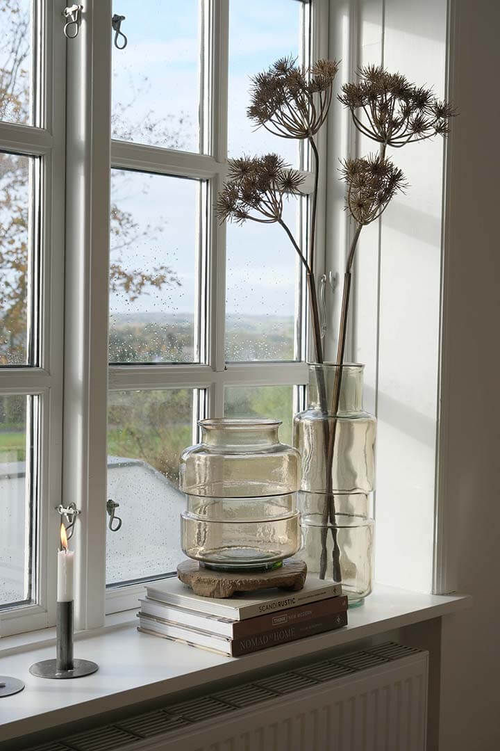 Denne stilrene smukke glasvase er en skulptur i sig selv og passer perfekt ind i den moderne indretning. Glasvasen er smuk både med blomster, rustikke grene eller den kan stilles på bordet med andre dekorative ting i forskellige størrelser, former og farver i et stilleben og dermed skabe et personligt og levende look. Vasen er lavet af 100% genbrugsglas, og der kan derfor forekomme små bobler og mindre ujævnheder i glasset.