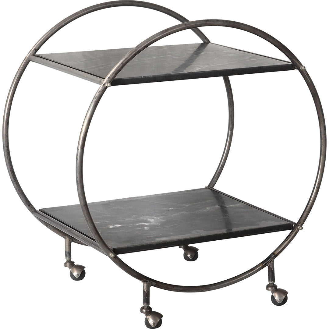 Stilfuldt rullebord i pulverlakeret jern med 2 sorte marmorhylder. Derudover er rullebordet udstyret med 4 hjul, så det er nemt at flytte fra rum til rum. En virkelig rå og elegant kombination af farver og materialer, der gør at rullebordet kan anvendes mange steder i din indretning, lige fra en fancy bartrolley til cocktails eller til nips på badeværelset eller i køkkenet. Det er kun fantasien der sætter grænser.