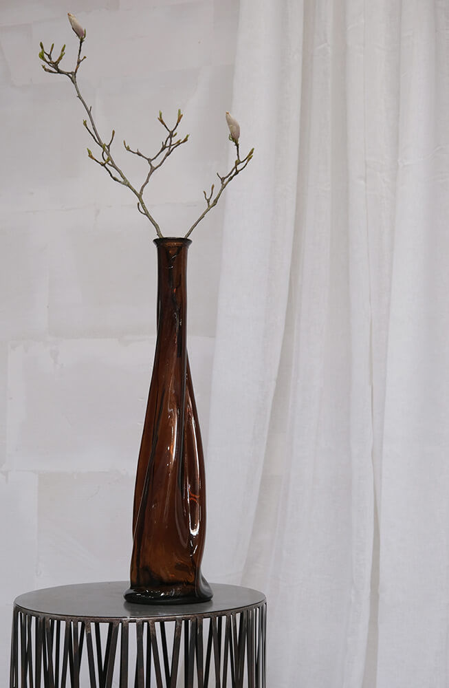 Paltrow gulvvasen i chokolade farve er skabt af tykt genbrugsglas, der med sit twist i designet giver en illusion af bølger selv uden vand i vasen. Hver vase er formet af dygtige håndværkere, der forvandler genbrugt glas til smukke vaser. Forestil dig, gulvvasen stå der og fange eftermiddagssolen, mens den viser et bundt af tørrede vilde græsser frem. Gå all in ved at mikse vasen med sin storesøster på 100 cm. Søg på Paltrow i søgefeltet.