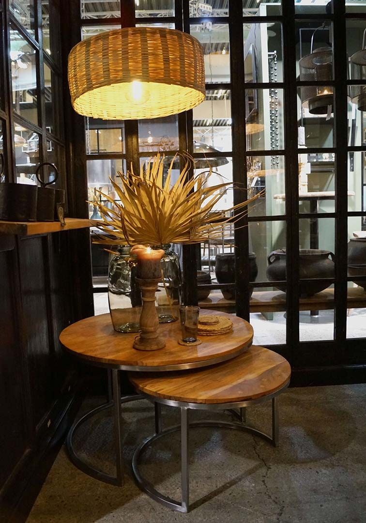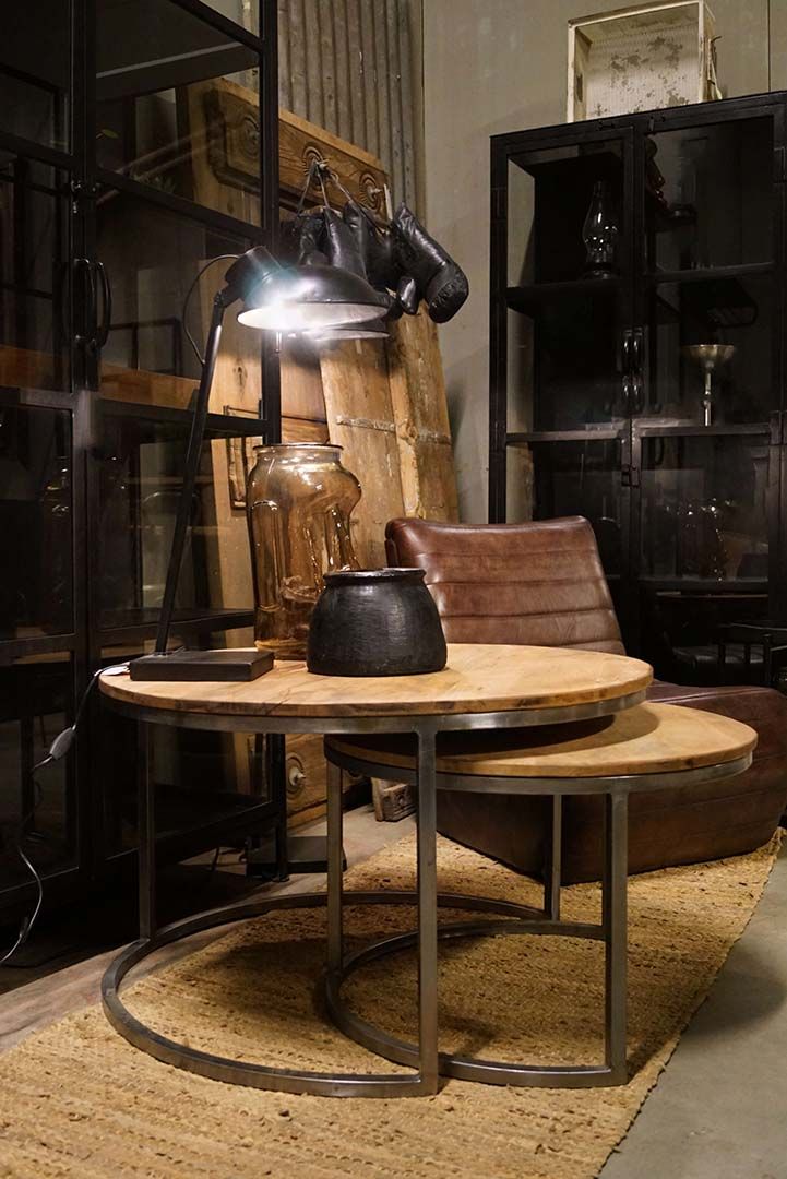 Indskudsborde i rundt design. De runde bordplader er fremstillet i genbrugstræ, og det enkle jernstel er med klar lak. Det mindste af sofabordene kan placeres helt inde under det store af sofabordene eller de kan stilles side om side. Så det giver mange muligheder i indretningen. Stor: H: 48cm x W: 82cm Lille: H: 40cm x W: 62cm