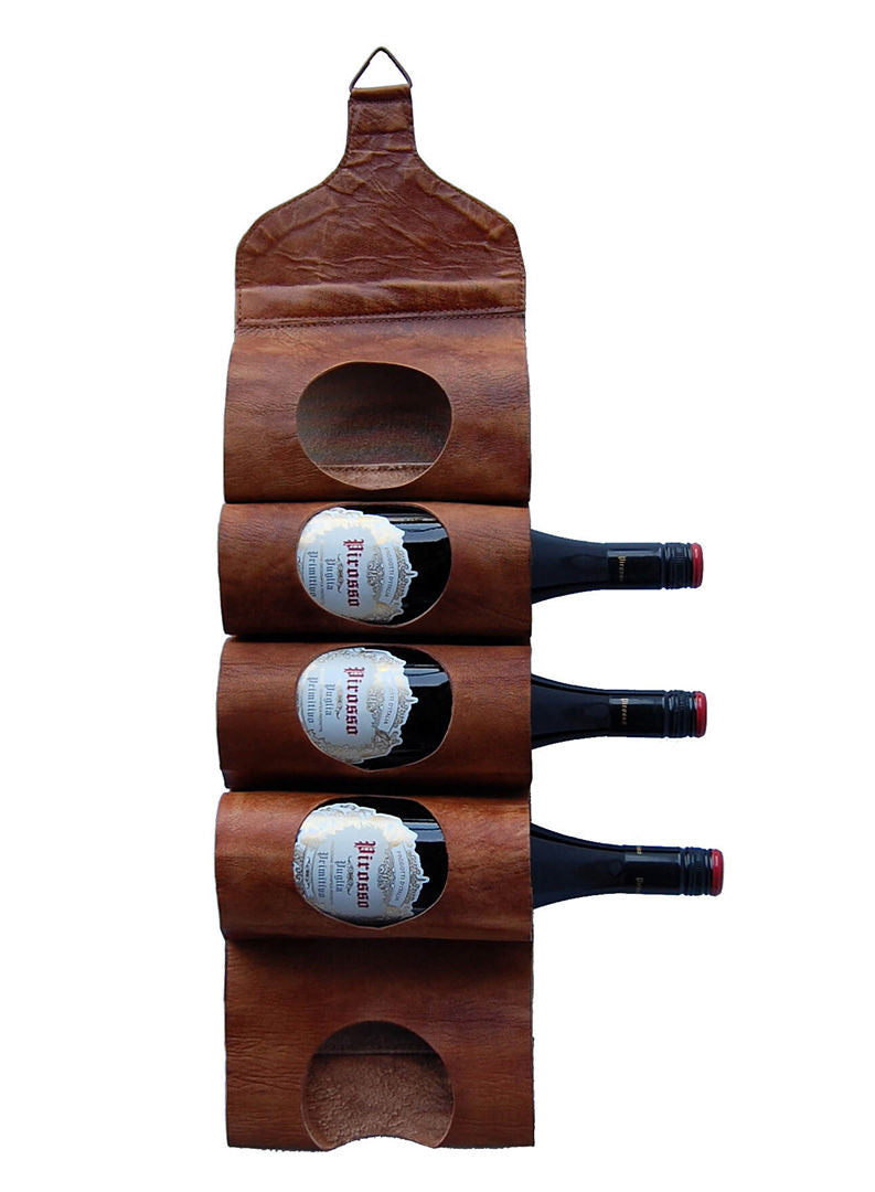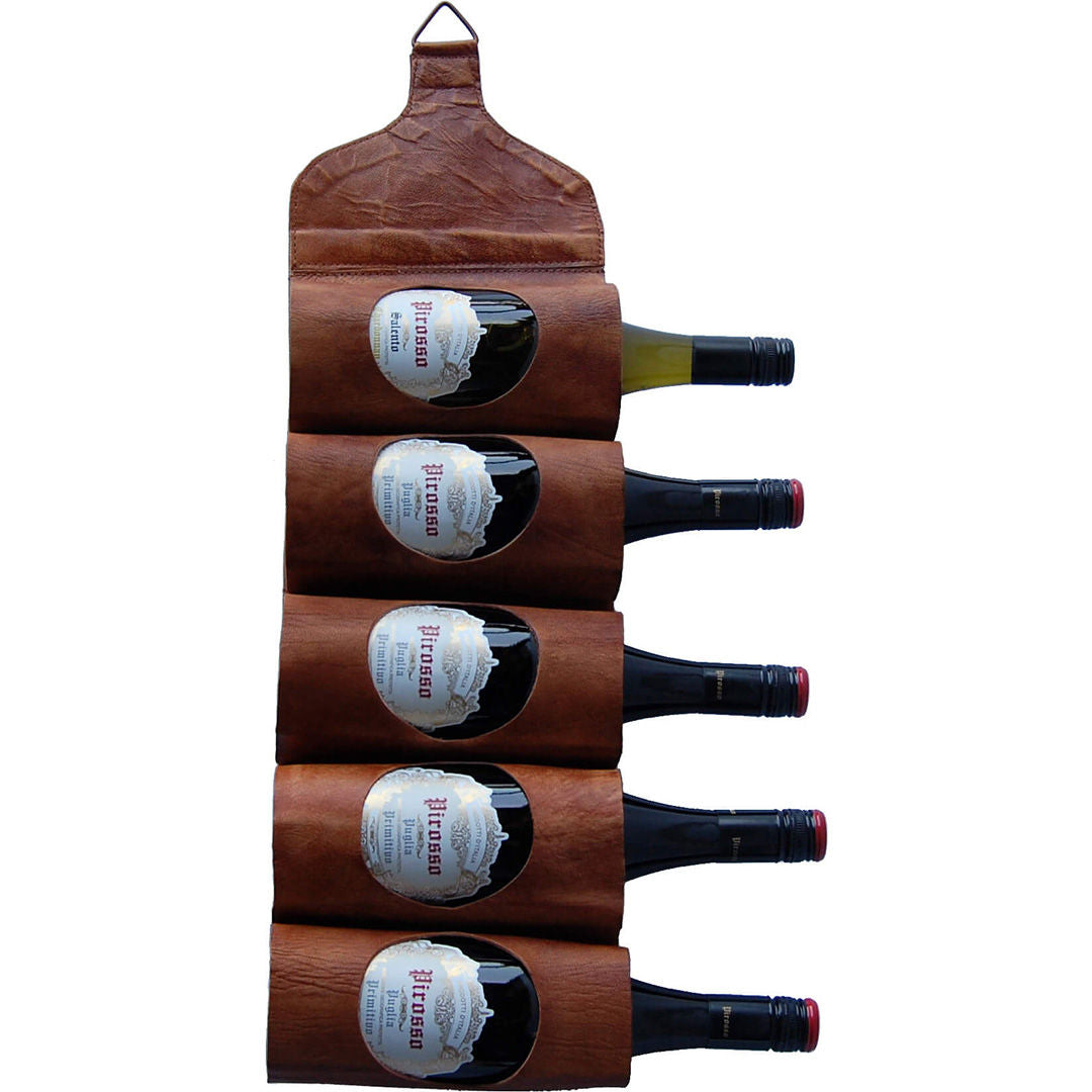 Her har du to-i-én. En magasinholder eller en vinholder, udført i brunt læder med plads til enten 5 flasker, 5 magasiner - eller et mix af begge. En vinreol i rustik look med kvalitet for øje og i skandinavisk stil. I designet er der tænkt på de små detaljer. Hullerne i læderet gør, at du kan se mærkatet på vinflasken eller navnet på magasinet. Den lille holder fylder ikke meget og kan derfor passe ind i de fleste hjem og vil også tage sig flot ud på væggen i din café eller restaurant.
