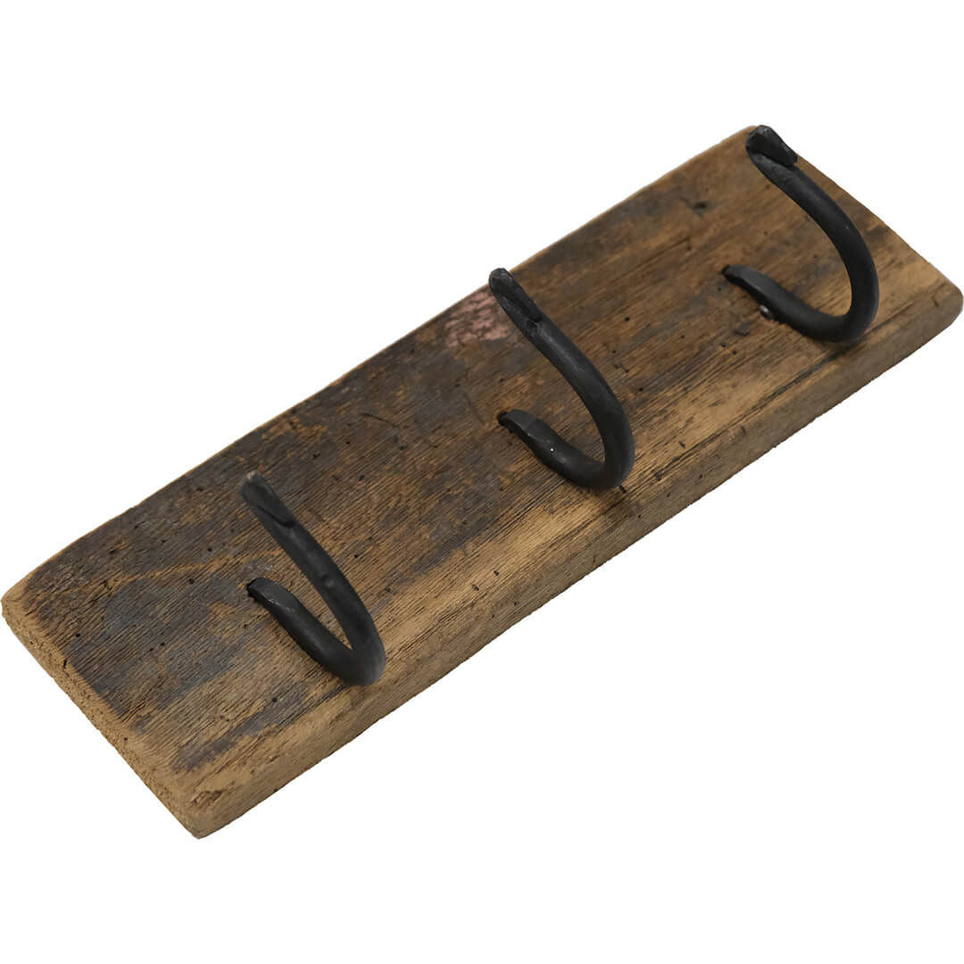 Knagen er fremstillet i genbrugstræ med tre industrielle, rå jernkroge. Brug knagerækken i entréen til jakker og tørklæder, i soveværelset til tøj og accessories, eller på badeværelset til håndklæder eller badekåber. Bliver du træt af knagerækken i det ene rum, kan du med fordel hænge den op i et andet rum og give knagerækken en ny funktion. Knagen kommer med to beslag, så det er nemt at hænge den op.