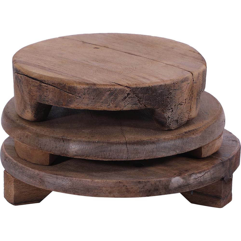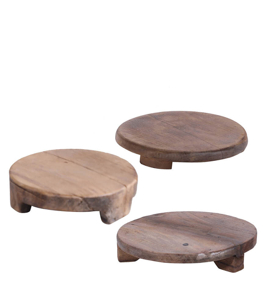 Gamle chapatibrætter af træ, der emmer af autentisk charme og historie. Disse runde brætter, som oprindeligt blev brugt i indiske køkkener, står på små fødder. De varierer i form og patina, hvilket vidner om deres tidligere liv. Perfekte til dekorative formål, hvor de kan bruges som basis for at fremvise dine yndlingsgenstande eller som små podier i din indretning. Med deres rå og rustikke udseende bringer de både funktion og karakter til ethvert rum.