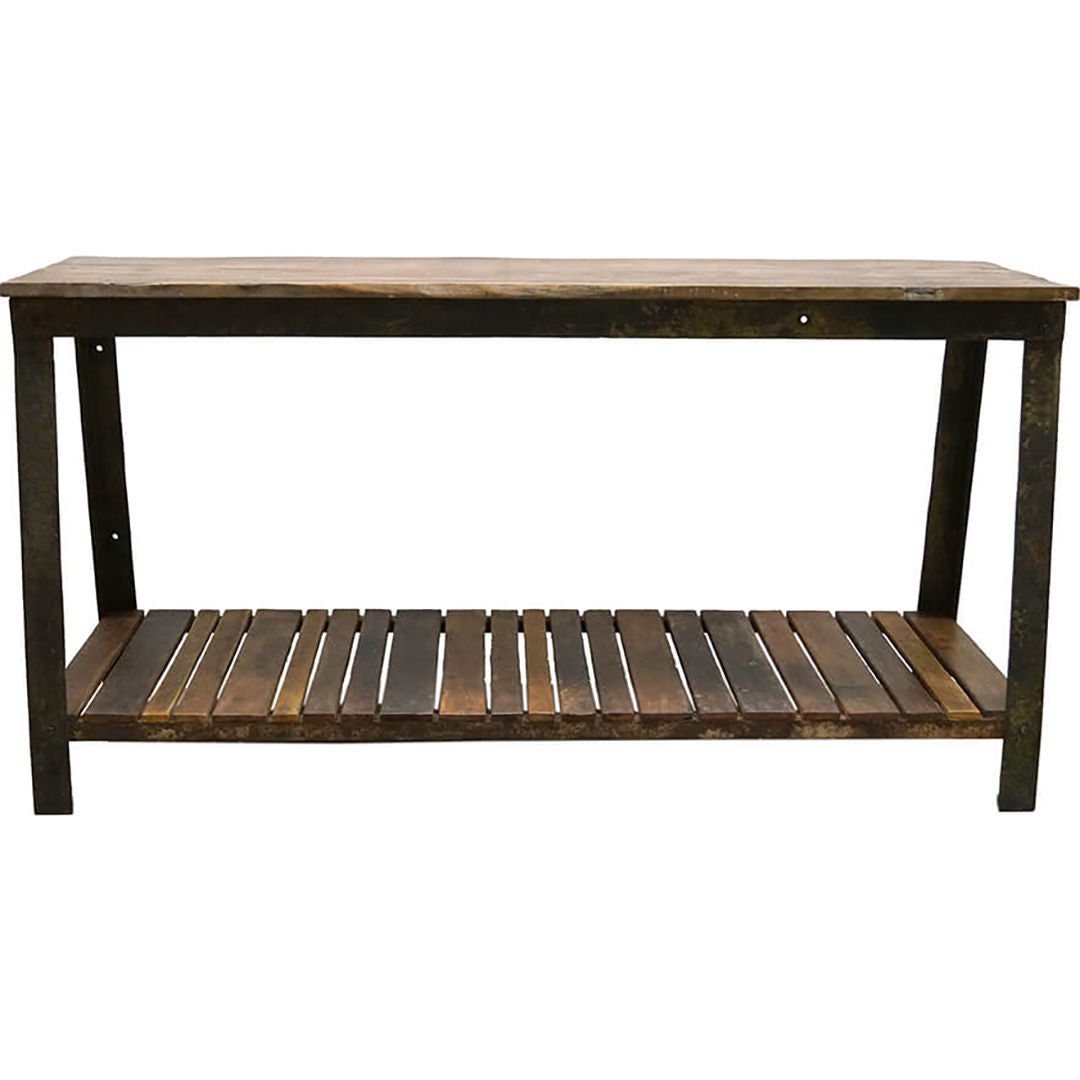 Stort rustikt træbord med smuk patineret bordplade, jernben og trælamel hylde under hele bordplade. Træbordet oser af unikhed og personlighed. BEMÆRK: Bordpladen er smallere (50 cm) end hylden forneden (59 cm)