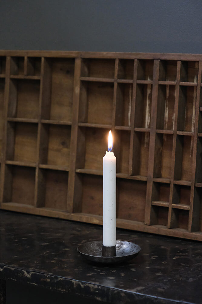 Fin og enkel lille lysestage i metal. Med sit runde design skaber den en hyggelig atmosfære i ethvert rum. Den er specielt designet til at holde et kronelys og giver et smukt og beroligende lys. Placer den på dit spisebord, i vindueskarmen eller hvor som helst, du ønsker at tilføre en stemningsfuld glød. Brug den alene eller placer gerne flere sammen i grupper.