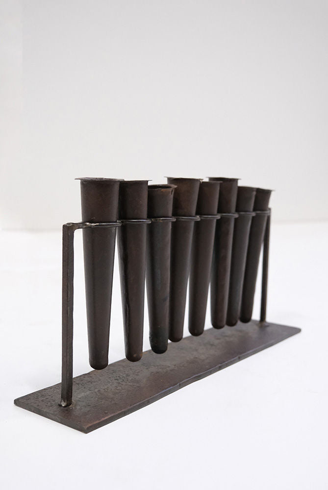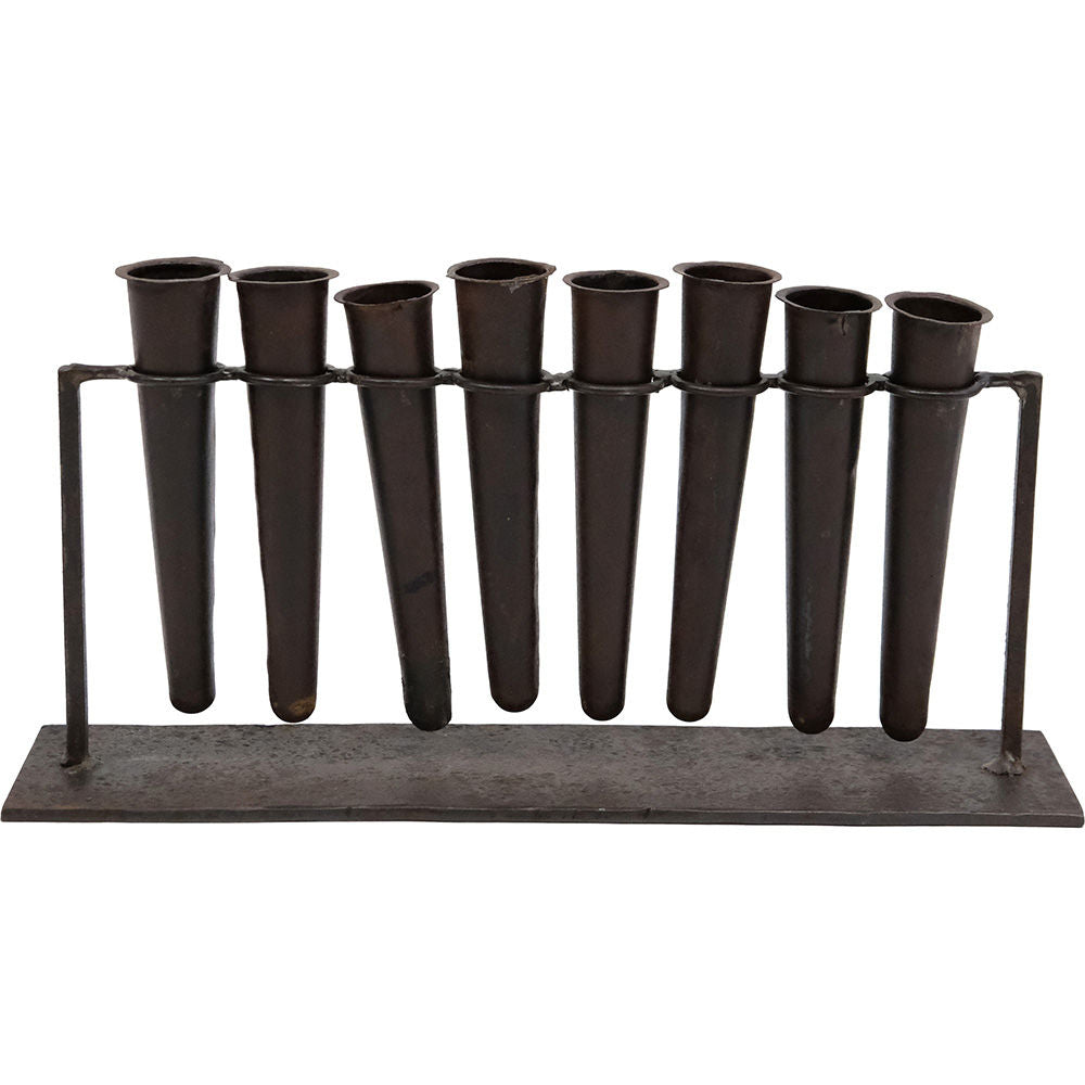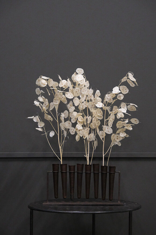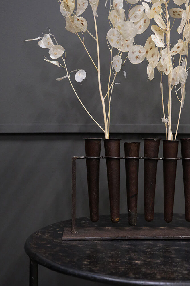 Robbie stativ med otte små vaser i metal - en sjov og alsidig måde at bringe naturens skønhed ind i din indretning. De 8 små vaser har oprindeligt været brugt som isforme, men er nu upcyclede til at holde dine fine blomsterkreationer. Stativet er råt og industrielt, og de otte små vaser i metal tilbyder en rustik ramme til dine yndlingsblomster eller grønne grene.