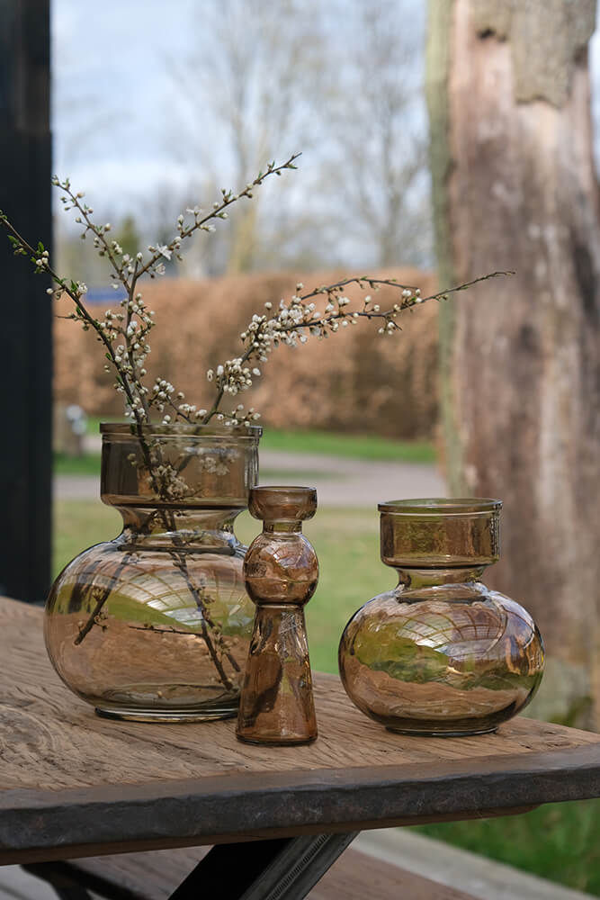 Forestil dig hvordan denne charmerende buttede vase kan tilføje et strejf af varme og hygge til dit hjem. Den tågede røgfarve har en lækker lys nuance, der skaber en stemning af forår og ny begyndelse. Den er supersmuk at kombinere med de grå og chokoladefarvede vaser. Med sit bløde, runde design og spejllignende glasfinish, fanger vasen lyset og tilfører en diskret glans til ethvert rum. Vasen er ideel til at vise friske grene eller markante blomster, og kommer i to størrelser i tre farver, perfekte til at vise sig frem alene eller som et par, der harmonerer med hinanden. Søg på "Roberts" i søgefeltet.