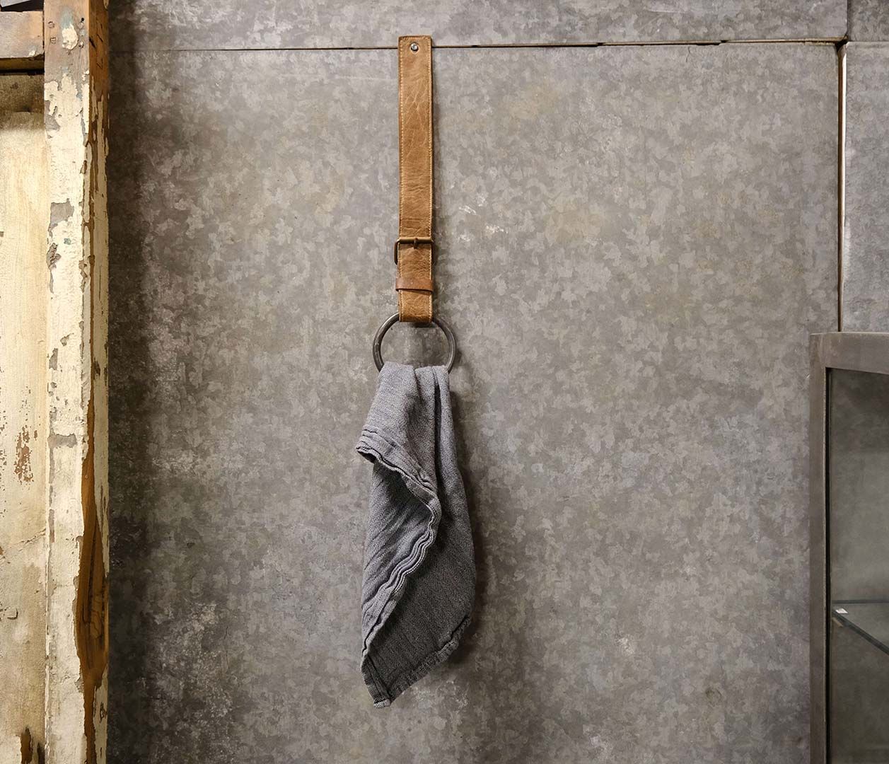 Elegant, strærk og funktionel læderstrop med jernring. Du kan dekorere dine vægge med disse flotte læderstropper og bruge dem i køkkenet til at hænge viskestykker på, i badeværelset til at hænge dine håndklæder på, i soveværelset eller entréen til at hænge dine tørklæder på. Læderstropperne er elegante og lukuriøse i deres design, hvilket gør dem perfekte til at skabe et stilfuldt element i din indretning. Der er en lille ring i toppen af læderstroppen, så den er let at hænge op på væggen.