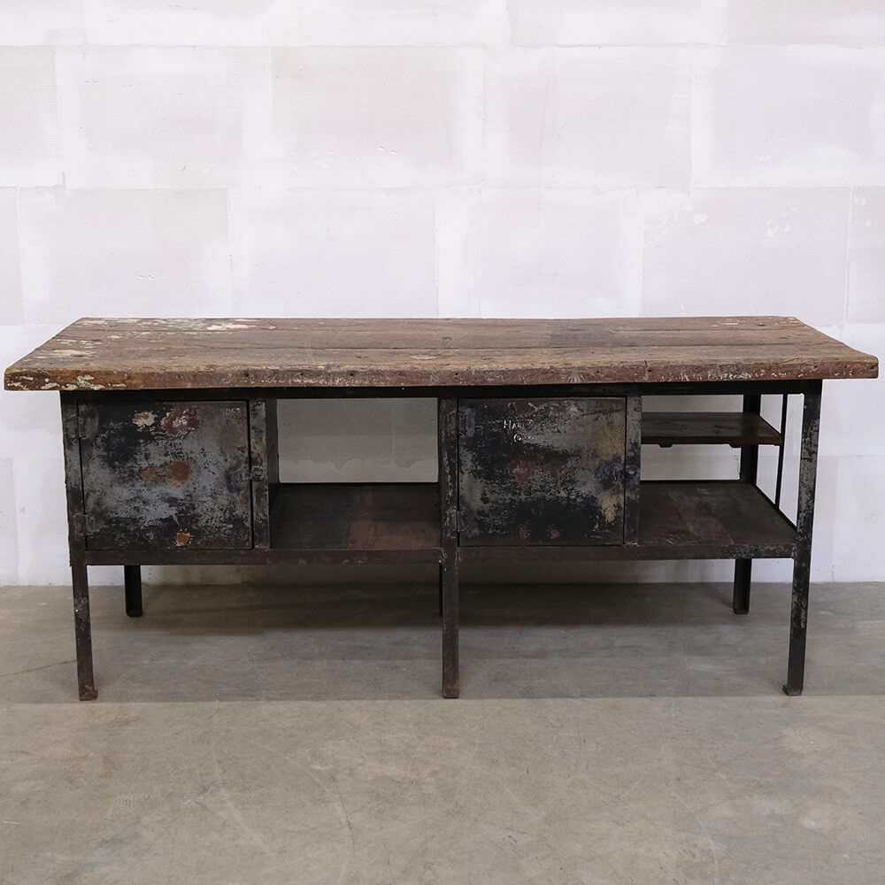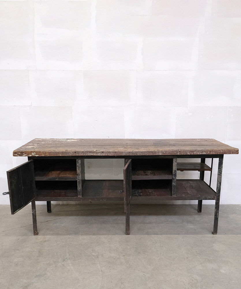 Råt, rustikt og fuld af karakter – denne industrielle disk er lavet af et gammelt lockerskab og bærer tydelige brugsspor. Den har en solid træbordplade med masser af patina, og de gamle metalskabe giver både kant og praktisk opbevaringsplads. Med sine åbne hylder og lukkede rum er den perfekt til opbevaring, samtidig med at den tilføjer en autentisk industriel stil til enhver butik, café eller restaurant. En rå skønhed med masser af autenticitet og historie.